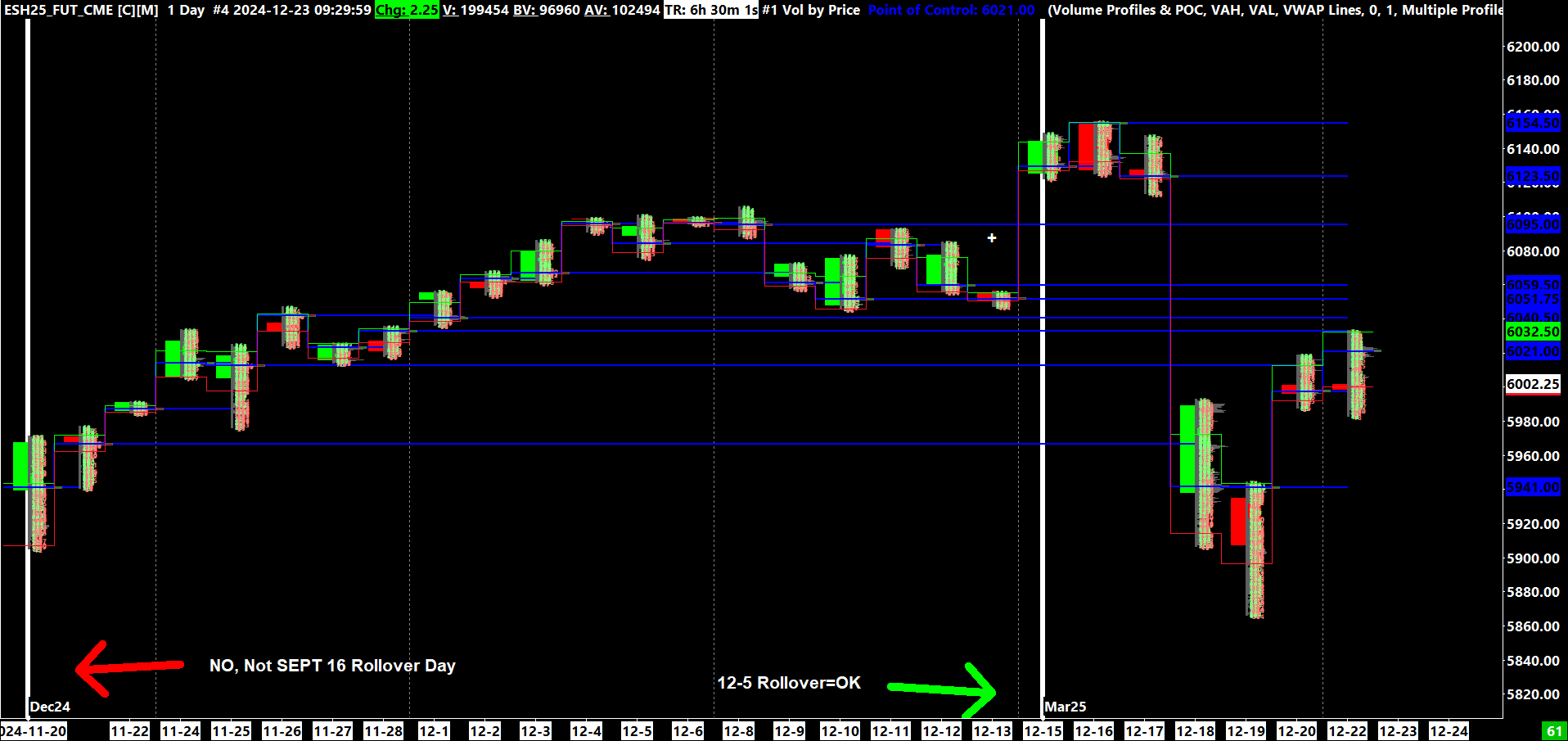 Thank you, the first one worked once I used the non-Global. The second one, I wish originally the term "never change" hadn't been used, bc that was obviously incorrect. (see comment 2023-12-15 post #5, from Sierra_Chart Engineering) Regardless, there was something else I noticed on this version. It is only on the daily (not 1 min in my case) Those lines/dates for Rollover date we were referring to above? The current MAR 25 shows fine on 12/15. Well, if I have the amount of days to load set to say, 15 days, the Rollover line/date still shows up for the previous Rollover (SEPT 24 in this case) on the far left candle (back 15 days in this example) I switched to more days and it still shows up on the most far left candle, even if not back to the actual Rollover date. Not a big thing, but obviously it should only be on the actual date every three months, and not showing up if the days loaded don't go back to the actual date. Hope this helps. Regards |