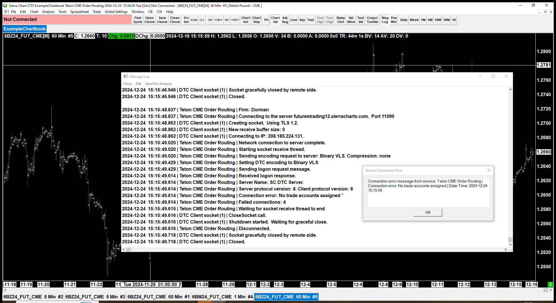 Refer to: Important Notice - Resolving: No trade accounts assigned Sierra Chart Support - Engineering Level Your definitive source for support. Other responses are from users. Try to keep your questions brief and to the point. Be aware of support policy: https://www.sierrachart.com/index.php?l=PostingInformation.php#GeneralInformation For the most reliable, advanced, and zero cost futures order routing, use the Teton service: Sierra Chart Teton Futures Order Routing |