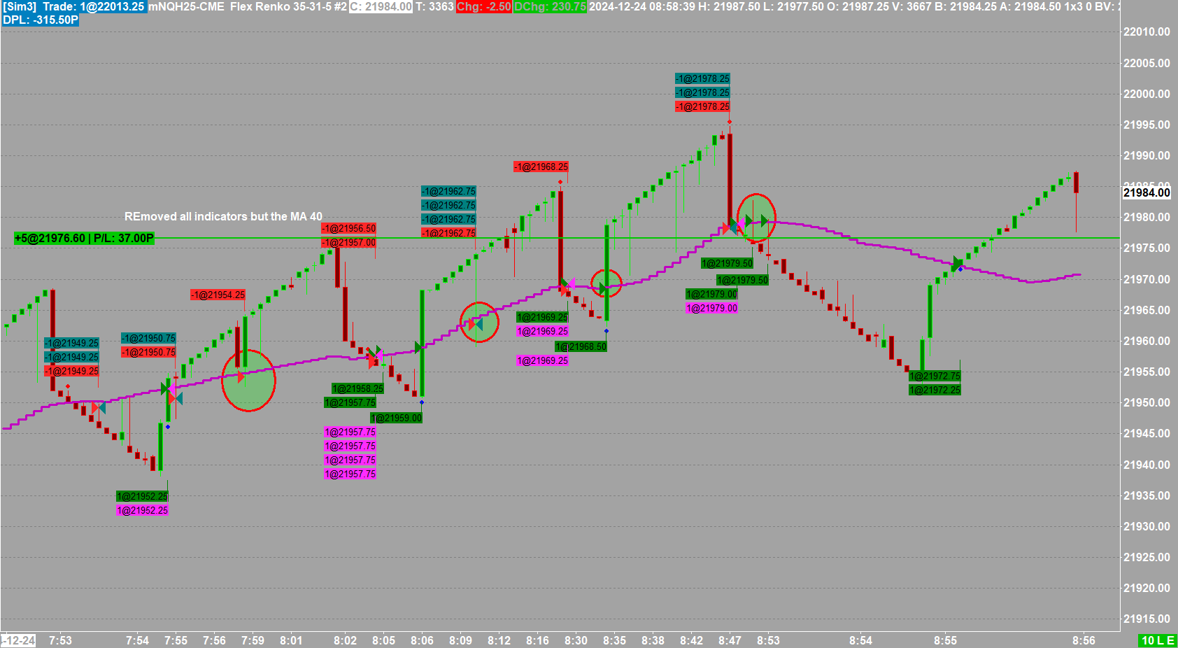 Chart is Flex Renko 35-31-5 ; I wonder if this is a problem to the order entry. Simple chart , I removed all but one indicator. Buy or sell is supposted to happen on Crossfrom above/below of a moving average. Evaluate on bar close is checked. However orders are executed immediately on the cross of the MA without waiting for the bar close. I have circled where there have been wicks where price goes through the MA but closes where there should be no trade but the trade has occurred before the bar close What am I missing? |
