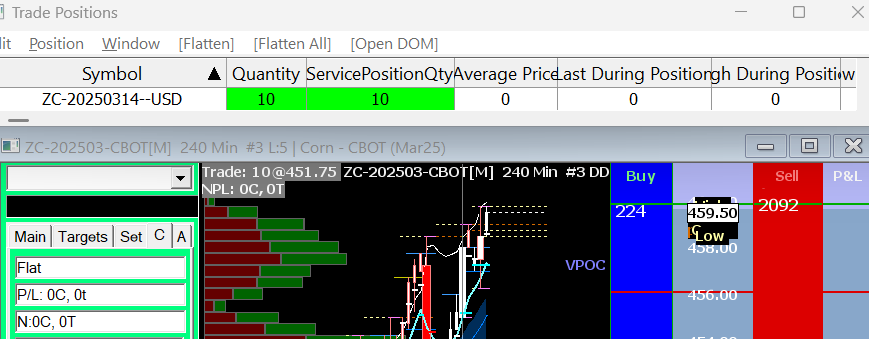 We just tried trading CBOT corn through TWS and we do see the correct position in the Trade Positions Window: Symbol Quantity Trade Account Average Price Open Profit/Loss Daily Profit/Loss Daily P/L Reset DateTime High During Position Low During Position Last During Position Margin Requirement ServicePositionQty Currency Entry DateTime MaxPotentialPosQty ZC-202503-CBOT 1 DU018 0.00 0.00 0.00 00:00:00 487.50 487.50 487.50 0.00 1 USD 00:00:00 0 And that symbol, we see matches with the chart. So everything is correct from the Sierra Chart side. You will need to have Interactive Brokers help with this. We also see you are running older versions of Sierra Chart. You need to update. We are not going to help you with older versions. It is important to update before contacting us. Sierra Chart Support - Engineering Level Your definitive source for support. Other responses are from users. Try to keep your questions brief and to the point. Be aware of support policy: https://www.sierrachart.com/index.php?l=PostingInformation.php#GeneralInformation For the most reliable, advanced, and zero cost futures order routing, use the Teton service: Sierra Chart Teton Futures Order Routing Date Time Of Last Edit: 2025-01-22 07:12:36