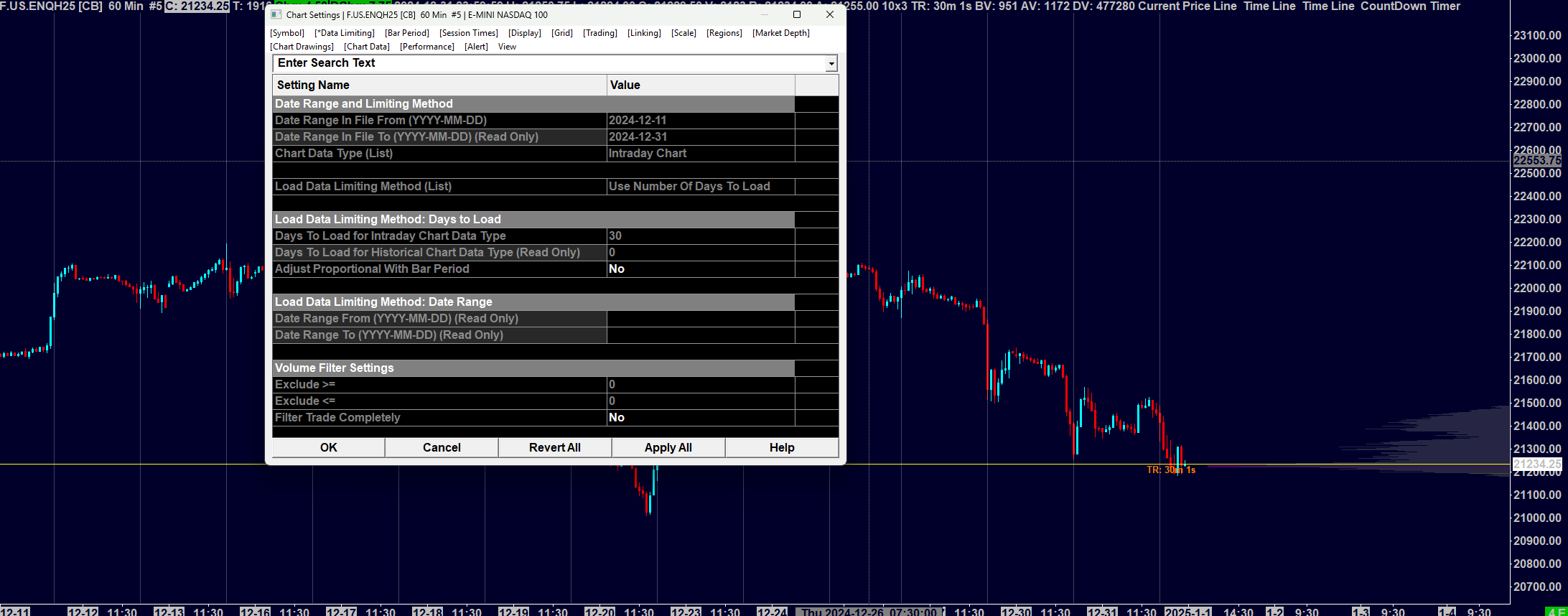Hi For some reason i am not able to download as much data as i would like for my intraday charts. If i set my timeframe to Daily or above then chart is changing to historical and this is fine i can see back for years. However when my timeframe is less then daily 4h 1h etc then chart is auto set to Intraday Chart and i can only load data for whatever is set on Date range in file from which is auto set to 2024-12-11 ( as of writing this message ). So no matter what settings i have for Data limiting method if date range or number of days to load with date range from and days to load for intraday chart set higher it will not show back more than 2024-12-11. If i select number of days to load and set days to load to 5 then i only get 5 days of data...so going lower its fine. I tried new chartbook, new symbol, delete all data, redownload, continous futures contract back adjusted, None Continous contract.....i have same behaviour. I just switched from delayed denali data to cqg data from AMP broker but i don't understand this behaviour. Any idea what could be? or it's just normal? Being on delayed data i was able to load as much as i would liked. I cannot set Date range in file from higher than 20 days. I attach how it looks. Thank you |