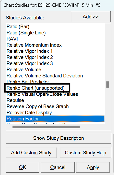 You need to use the Renko Bar Period Type in Chart Settings. There are four different types of them. Here is full documentation: Renko Bar Charts And that screenshot is not the Chart Settings window but the interface for adding a custom study. Sierra Chart Support - Engineering Level Your definitive source for support. Other responses are from users. Try to keep your questions brief and to the point. Be aware of support policy: https://www.sierrachart.com/index.php?l=PostingInformation.php#GeneralInformation For the most reliable, advanced, and zero cost futures order routing, use the Teton service: Sierra Chart Teton Futures Order Routing Date Time Of Last Edit: 2025-01-05 18:21:04