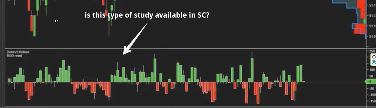 Can't see your images but this is a Cummulative Delta Histogram that matches the original SC study. Settings: -Calculate on Volume, Up/Dn Tick Volume, Trades -Color based on +/- 0 or Slope -Reset Time (start from zero based on specific time input) |