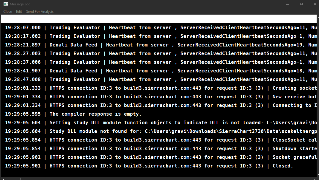 Please do the following: - Select "Window >> Message Log" - Select "Edit >> Clear Log". Select "Yes" to the query of whether you really want to clear or not. - Select "Analysis >> Studies >> Add Custom Study" -- If you have a group that should contain your custom study then open that. -- If your study is listed in that group, then select it and select "Add". - On your Message Log select "Edit >> Send for Analysis" (this looks like a menu, but is a button - Post in this thread that you sent us your Message Log. For the most reliable, advanced, and zero cost futures order routing, use the Teton service: Sierra Chart Teton Futures Order Routing |