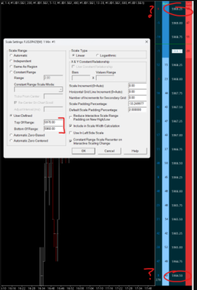 Hi, I have a good coder creating a custom study that sets the User Defined Top/Bottom of Range and it is populating the UserDefined top/bottom of range however the chart isn't reflecting this. It does not change scale even though the settings show correct levels. Is there a call that forces the chart to update to this or any ideas why this isn't working? Hard to see in pic as discord often distorts it but you can see the top/bottom of range is updated but chart doesn't. |