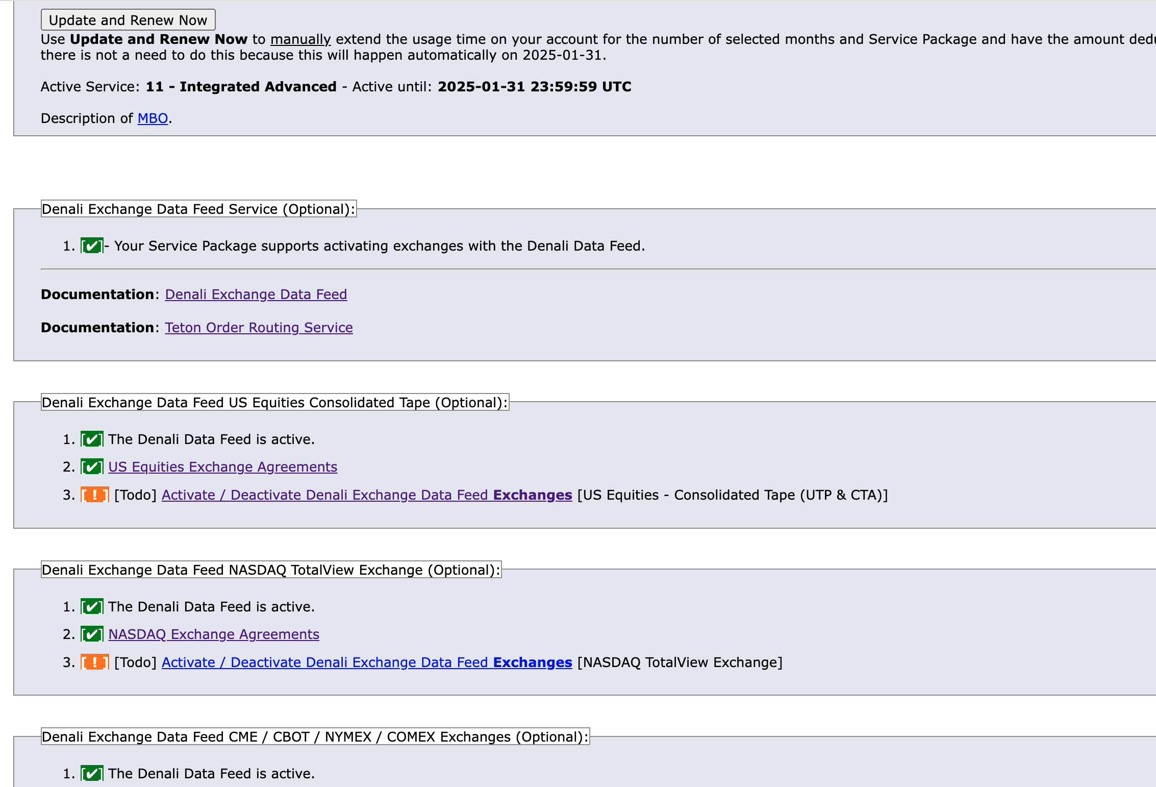 You do not have any exchanges active for our Denali Exchange Data Feed. As such, you are not able to get any data, since we do not support data from CQG for the CME Group and EUREX. Activate the exchange(s) for which you want real-time data at the following link: https://www.sierrachart.com/UserControlPanel.php?page=DenaliDataFeed#Exchanges If you do not have enough funds in your account to cover the cost of the exchanges, then you can add funds on our Payments page at the following link: https://www.sierrachart.com/UserControlPanel.php?page=AddAccountCredit#MoveToTop For the most reliable, advanced, and zero cost futures order routing, use the Teton service: Sierra Chart Teton Futures Order Routing |