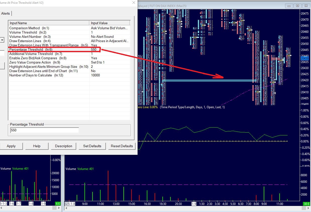 ... @User266447 be so kind and let me know what "Comparison Method" you opted for "aggressiveness" will not be shown unless you went for "diagonal" option also you do not have to use that indicator at all...it could be set as a column in NUMBERS chart with distinctive coloring user j4ytr4der said "showing you market orders that have traded at each price"...well also executed limit orders are in but market orders make "aggressiveness" user --------- correctly stated arbitrary nature of thresholds (I set mine at 300%) ... and this much nothing out there could be compared to SIERRA CHART data feed (mighty DENALI) ... if you fancy I can show you my complete set-up; images of NUMBERS chart without indicator you are about to use all free of course ... user binaryduke was so right you need full understanding of what is in front of you wish you all the best |
