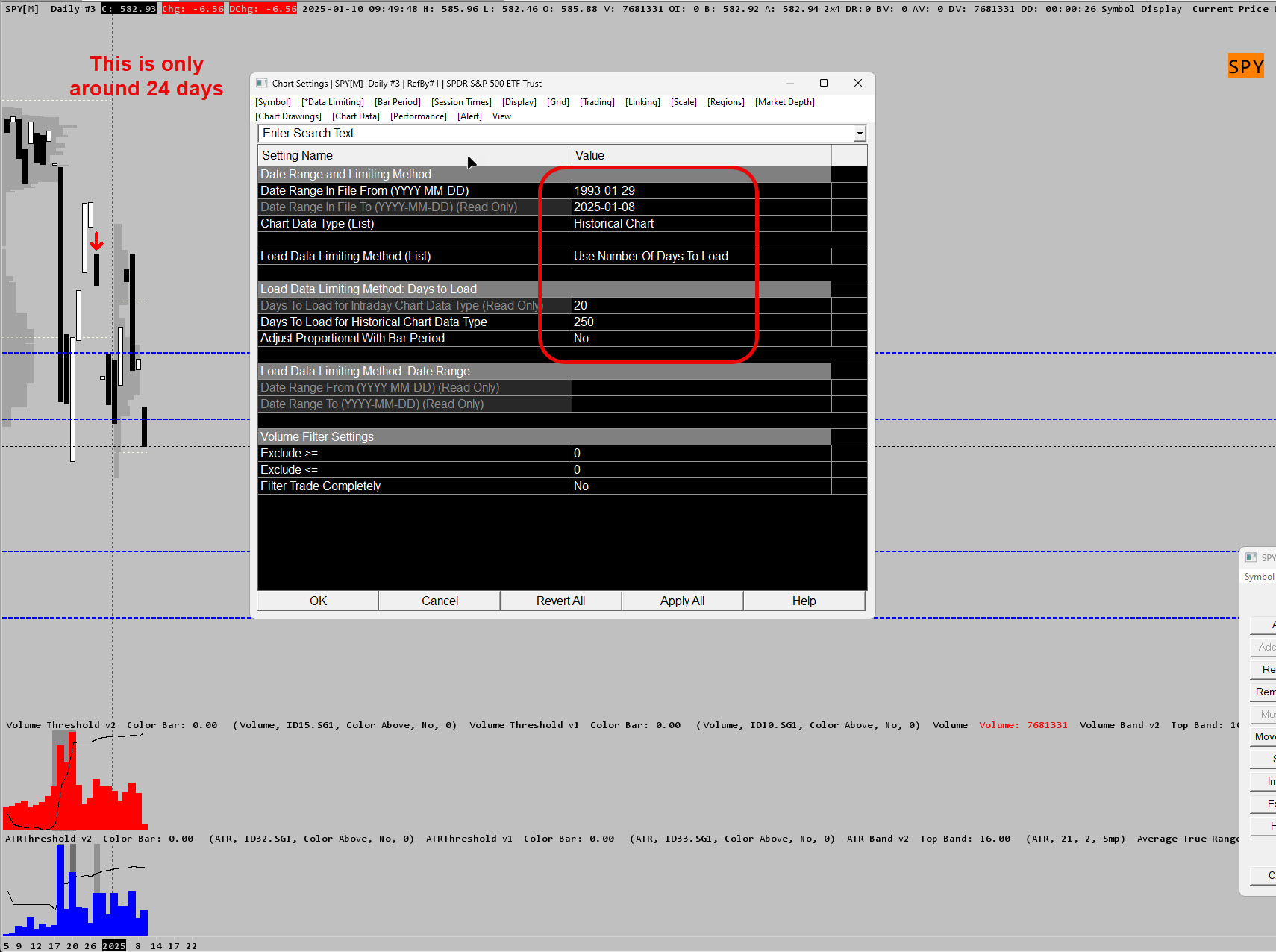 Hi, Everything was working fine until today when I opened the charts and it only loads around 24 days of historical chart of any symbols. It was fine yesterday but when I startup the computer, SC just limits my charts. I didnt even change any settings but now the chart won't load the settings' charts no. of days. I tried to redownload the data but it still doesnt allow me to load the number of days that I specified. |
