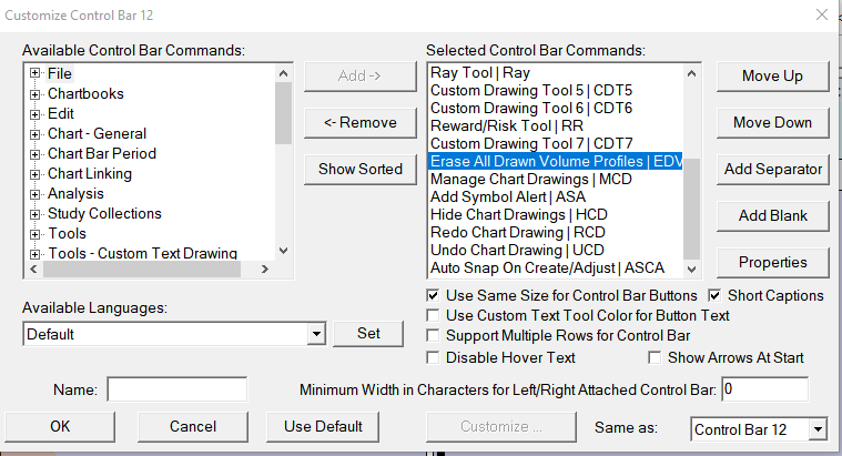 We are not seeing any issue with the functionality of Erase All Drawn Volume Profiles" and the option is available in the Control Bar customization options. The one thing we want to point out is that the option for the Control Bar button is located after the "Volume Profile Tool" in the list, it is not with the other delete options after the rest of the tools themselves. If you are having a problem with this functioning correctly, then please update to the latest release to ensure it is not something release related and then let us know if you are still having an issue on the latest release. For the most reliable, advanced, and zero cost futures order routing, use the Teton service: Sierra Chart Teton Futures Order Routing |