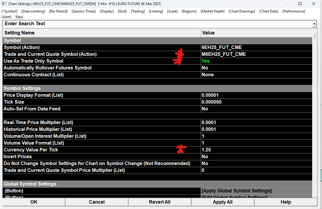 Based on Sierra_Chart Engineering answer, I've read his link and modified "Trade and Current Quote Symbol Price Multiplier" to 1 for 6E/M6E. However, with Jonh's answer, I'd need to modify for 6E/M6E : Price Display Format: .00001 Tick Size: .0001 Trade and Current Quote Symbol Price Multiplier: 1 The current Tick Size is 0.000050. Do I really need to modify it to 0.0001? I'd appreciate a more direct answer on this than just "refer to the documentation". We're talking about real money here. What's the impact of the modification of the Tick Size? Are you 100% sure I must modify the tick size? Please understand I just want to be sure. Also, why the modification of the Tick size is not indicated on the link Sierra_Chart Engineering provided which has a specific example of 6E/M6E? Thanks Date Time Of Last Edit: 2025-01-16 18:52:36