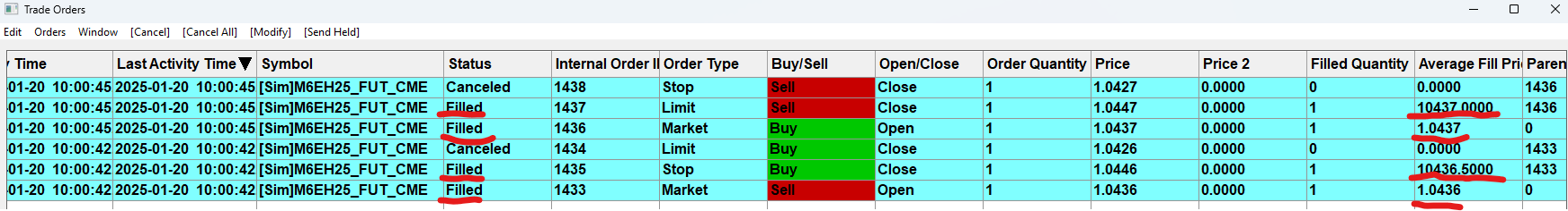 After many tests and hours trying to fix it, the "Trade and Current Quote Symbol" feature is not working properly on 6E/M6E forex futures because of the bracket order, it's a Sierra Chart bug. The bracket order is the problem because they don't get executed with the correct multiplier (Trade and Current Quote Symbol Price Multiplier). Only the INITIAL market order is executed with the correct multiplier, not the bracket orders, so even though the initial market orders are properly executed, the position get cancelled instantly because the incorrect bracket orders get filled instantly. Sell Market Bracket: As you can see in the attached screenshot, when I do a sell market with attached bracket order, the initial sell market order is executed correctly and filled at 1.0436 in this example, but a buy stop is instantly executed at 10436 which instantly close the position. Buy Market Bracket: For a buy market with attached bracket order, the initial buy market order is executed correctly and filled at 1.0437 in this example, but a sell limit is instantly executed at 10437 which instantly close the position. Can you please fix the issue that bracket orders don't get the correct multiplier? Trading without an initial bracket order is not an option, there could be a huge spike by the time the stop loss is set. Date Time Of Last Edit: 2025-01-20 16:02:38