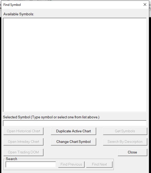 You should still be able to get Symbols even on an expired account. Follow the instructions here to update the Symbol Settings: Global Symbol Settings: Update Global Symbol Settings And if you still have no symbols in File >> Find Symbol we need to see the Message Log: Support Board Posting Information: How to Post Your Message Log (Required In Some Cases) Actually we see what the problem is now. You do not even have Sierra Chart installed. Or you are not using the Sierra Chart account that you have posted on this support board with. That is the issue. Sierra Chart Support - Engineering Level Your definitive source for support. Other responses are from users. Try to keep your questions brief and to the point. Be aware of support policy: https://www.sierrachart.com/index.php?l=PostingInformation.php#GeneralInformation For the most reliable, advanced, and zero cost futures order routing, use the Teton service: Sierra Chart Teton Futures Order Routing Date Time Of Last Edit: 2025-03-10 19:43:28