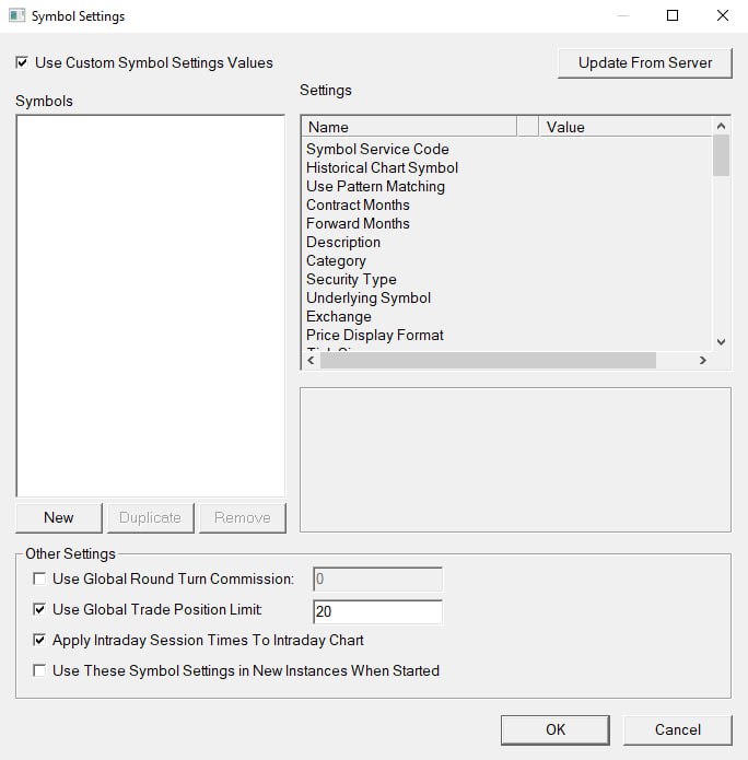 There is no "Custom Symbol Settings" for FXCM. Your account is "expired". We do not give support for expired accounts. If you want to continue to use Sierra Chart, you will need to purchase a package. For the most reliable, advanced, and zero cost futures order routing, use the Teton service: Sierra Chart Teton Futures Order Routing |