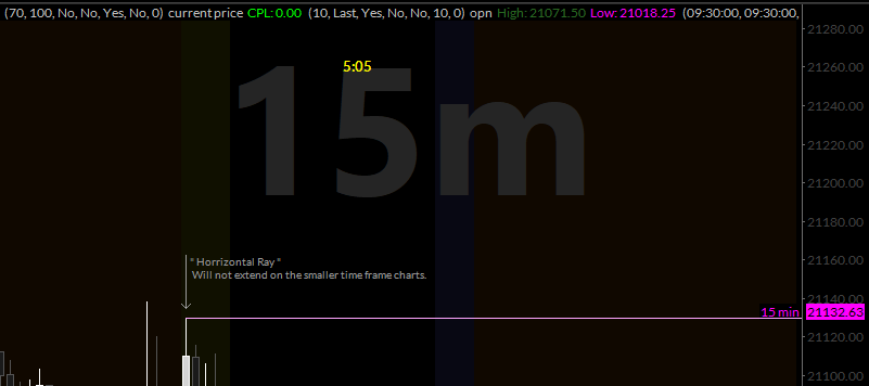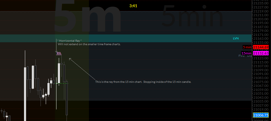 Attached is an example of what I am talking about. As you can see the horizontal ray does not stop at an intersection on a different time frame. You can see on the 5 min chart the ray will not extend when drawn on the 15 min chart. This makes the tool a bit useless if you want to use drawings that translate to multiple charts. This does not happen on every instance, but the tool can't be trusted. I would have to say that this is an issue. |