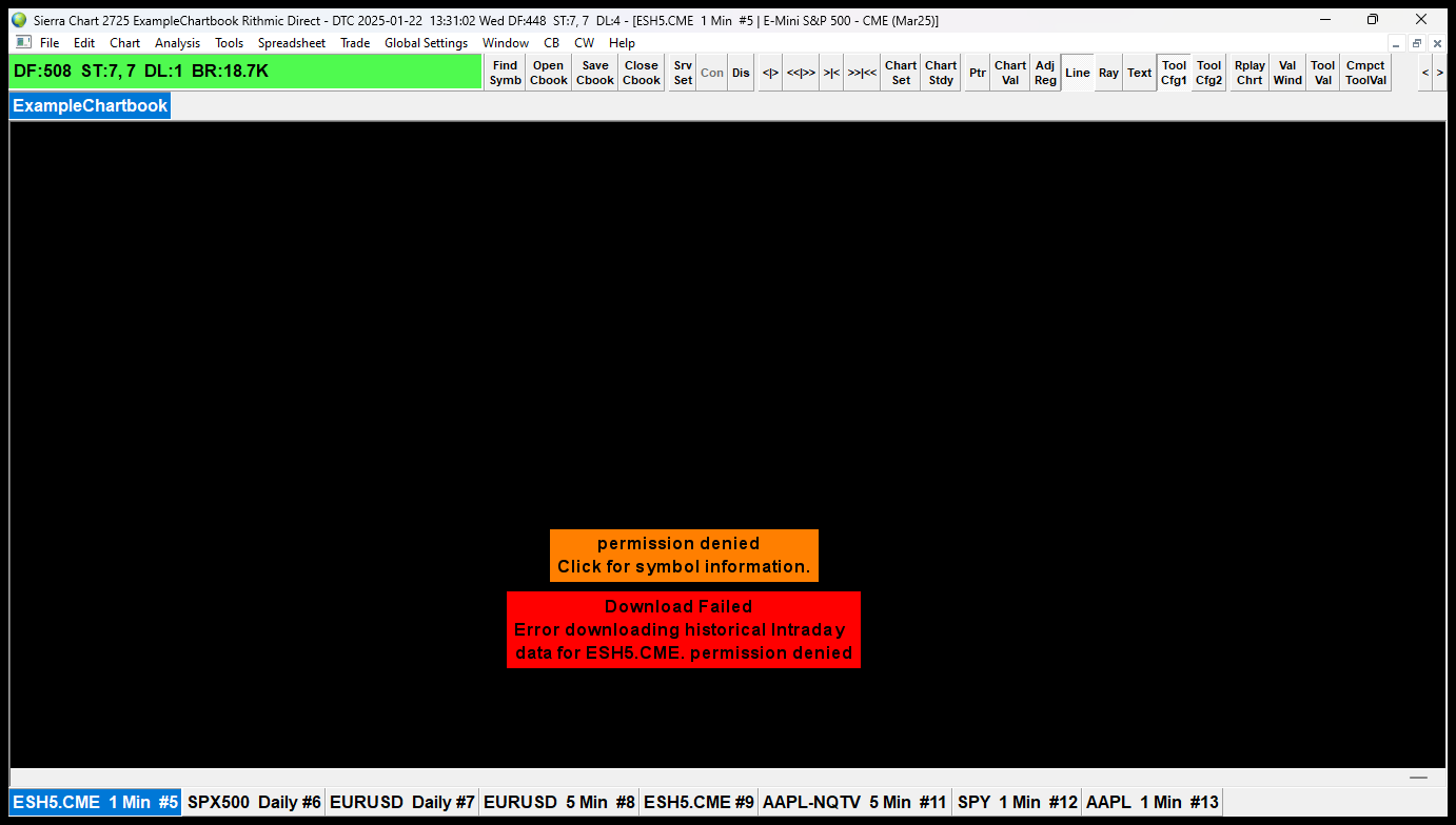 None of these have resolved my issue im not sure whats happening. Im using rithmic as my service but sierra as my trading data, my higher time frames pop up but lower time frames just show a blank screen and no longer has the "permission denied" like I stated before. It's like the program wants to load it but cant, and this happens on previous versions of sierra as well. I've logged into rithmic to see if I needed to sign anything but nothing has showed. I've asked folks on reddit and they seem just as confused, I should be able to use denali while trading on my prop account but that doesnt seem to be the case here.