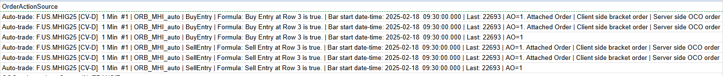 Screenshot in post #5 shows working orders after the Scale-IN, but without increased quantity (position is 2 lots, attached orders only 1 lot.) Thank you for considering this issue. I have attached two TAL files. 1. MHI_Problem_TradeActivityLog_2025-02-18 ... this is the TAL for a trade on Feb 18th where Scale-In did not work (which is rare, but does happen) At 9:31:04 I manually increased the qty for attached orders after Scale-In failed. This is row 43 in a spreadsheet view. And for comparison: 2. MHI_Correct_TradeActivityLog_2025-02-17 ... this is the TAL for a trade on Feb 17th where Scale-In worked correctly (as it usually does). At 9:30:10 you see the second fill and the Scale-In comments in row 48 in a spreadsheet. |