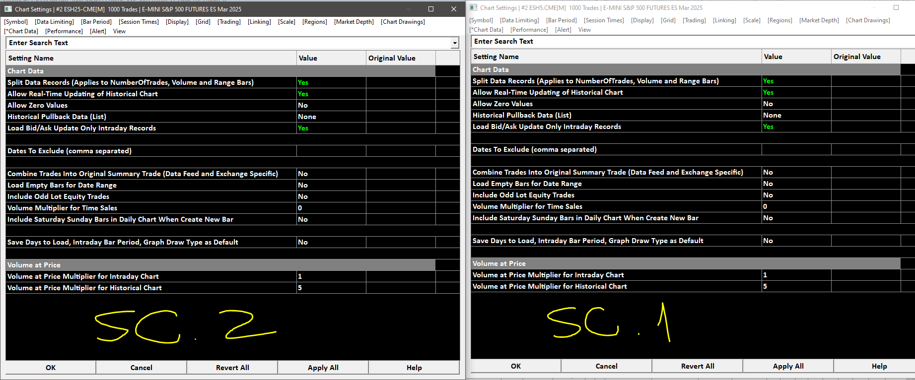 We do not know what happened or why. We understand that the Chart Settings should be the same, and they are. Those are the only items that would affect how the charts would be different though, which is why we specifically pointed them out. There is nothing at a Global Level that would have an impact like what you are seeing. Although this should not make a difference, are these installations on the same computer or on different computers? We are wondering if one may be getting the Delayed Streaming data. For the most reliable, advanced, and zero cost futures order routing, use the Teton service: Sierra Chart Teton Futures Order Routing |