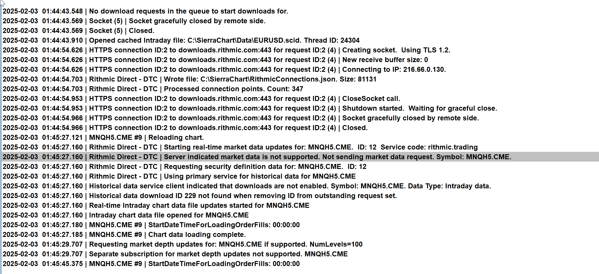 Notice: Not connected to Live trading account to receive CME real-time futures data at non-professional fees. why does it say this? can you please check because i am using an account from apex funding trading for an evaluation account so i am a non-pro trader! where are my logs: 2025-02-03 03:54:58.571 | Rithmic Direct - DTC | Using server connection: Apex-Chicago Area-Non-Aggregated 2025-02-03 03:54:58.571 | Rithmic Direct - DTC | Trading server address/port: rsc.rithmic.com:50528 2025-02-03 03:54:58.571 | Rithmic Direct - DTC | Connecting to the server rsc.rithmic.com. Port 50528 2025-02-03 03:54:58.619 | DTC Client socket (1) | Creating socket. Using TLS 1.2. 2025-02-03 03:54:58.619 | DTC Client socket (1) | New receive buffer size: 0 2025-02-03 03:54:58.619 | DTC Client socket (1) | Connecting to IP: 216.57.156.163. 2025-02-03 03:54:58.703 | Rithmic Direct - DTC | Network connection to server complete. 2025-02-03 03:54:58.703 | Rithmic Direct - DTC | Starting socket receive thread. 2025-02-03 03:54:58.703 | Rithmic Direct - DTC | Setting DTC encoding to Binary 2025-02-03 03:54:58.703 | Rithmic Direct - DTC | Sending logon request message. 2025-02-03 03:54:58.772 | Rithmic Direct - DTC | Received logon response. 2025-02-03 03:54:58.772 | Rithmic Direct - DTC | Server Name: . 2025-02-03 03:54:58.772 | Rithmic Direct - DTC | Server protocol version: 8. Client protocol version: 8 2025-02-03 03:54:58.772 | Rithmic Direct - DTC | Successfully connected. 2025-02-03 03:54:58.772 | Rithmic Direct - DTC | Trading is supported. 2025-02-03 03:54:58.772 | Rithmic Direct - DTC | Order cancel and replace is supported. 2025-02-03 03:54:58.772 | Rithmic Direct - DTC | OCO Orders supported. 2025-02-03 03:54:58.772 | Rithmic Direct - DTC | Symbol and Exchange Delimiter: . 2025-02-03 03:54:58.772 | Rithmic Direct - DTC | MarketDepthIsSupported: 0 2025-02-03 03:54:58.772 | Rithmic Direct - DTC | Connected to server complete. 2025-02-03 03:54:58.774 | No download requests in the queue to start downloads for. | Number times message added: 3 2025-02-03 03:54:58.774 | Notice: Not connected to Live trading account to receive CME realtime futures data at non-professional fees. 2025-02-03 03:54:58.928 | Using symbol data fast lookup vector 2025-02-03 03:54:58.928 | Rithmic Direct - DTC | Starting real-time market data updates for: MNQH5.CME. ID: 1 Service code: rithmic.trading 2025-02-03 03:54:58.928 | Rithmic Direct - DTC | Server indicated market data is not supported. Not sending market data request. Symbol: MNQH5.CME. 2025-02-03 03:54:58.928 | Rithmic Direct - DTC | Requesting security definition data for: MNQH5.CME. ID: 1 2025-02-03 03:54:58.928 | Rithmic Direct - DTC | Using primary service for historical data for MNQH5.CME 2025-02-03 03:54:58.928 | Historical data service client indicated that downloads are not enabled. Symbol: MNQH5.CME. Data Type: Intraday data. 2025-02-03 03:54:58.928 | Historical data download ID 236 not found when removing ID from outstanding request set. 2025-02-03 03:54:58.928 | Real-time Intraday chart data file updates started for MNQH5.CME 2025-02-03 03:54:58.928 | Intraday chart data file opened for MNQH5.CME 2025-02-03 03:54:59.090 | Rithmic Direct - DTC | Starting real-time market data updates for: MNQH25-CME. ID: 2 2025-02-03 03:54:59.090 | Rithmic Direct - DTC | Server indicated market data is not supported. Not sending market data request. Symbol: MNQH25-CME. 2025-02-03 03:54:59.090 | Rithmic Direct - DTC | Requesting security definition data for: MNQH25-CME. ID: 2 2025-02-03 03:54:59.090 | Rithmic Direct - DTC | Using primary service for historical data for MNQH25-CME 2025-02-03 03:54:59.090 | Historical data service client indicated that downloads are not enabled. Symbol: MNQH25-CME. Data Type: Intraday data. 2025-02-03 03:54:59.091 | Historical data download ID 237 not found when removing ID from outstanding request set. 2025-02-03 03:54:59.091 | Real-time Intraday chart data file updates started for MNQH25-CME 2025-02-03 03:54:59.091 | Intraday chart data file opened for MNQH25-CME 2025-02-03 03:55:03.660 | Rithmic Direct - DTC | Starting real-time market data updates for: CLK20-NYMEX. ID: 3 2025-02-03 03:55:03.660 | Rithmic Direct - DTC | Server indicated market data is not supported. Not sending market data request. Symbol: CLK20-NYMEX. 2025-02-03 03:55:03.660 | Rithmic Direct - DTC | Requesting security definition data for: CLK20-NYMEX. ID: 3 2025-02-03 03:55:03.668 | Rithmic Direct - DTC | Starting real-time market data updates for: CLM20-NYMEX. ID: 4 2025-02-03 03:55:03.668 | Rithmic Direct - DTC | Server indicated market data is not supported. Not sending market data request. Symbol: CLM20-NYMEX. 2025-02-03 03:55:03.668 | Rithmic Direct - DTC | Requesting security definition data for: CLM20-NYMEX. ID: 4 2025-02-03 03:55:03.670 | Rithmic Direct - DTC | Starting real-time market data updates for: CLN20-NYMEX. ID: 5 2025-02-03 03:55:03.670 | Rithmic Direct - DTC | Server indicated market data is not supported. Not sending market data request. Symbol: CLN20-NYMEX. 2025-02-03 03:55:03.670 | Rithmic Direct - DTC | Requesting security definition data for: CLN20-NYMEX. ID: 5 2025-02-03 03:55:03.671 | Rithmic Direct - DTC | Starting real-time market data updates for: ESM20-CME. ID: 6 2025-02-03 03:55:03.671 | Rithmic Direct - DTC | Server indicated market data is not supported. Not sending market data request. Symbol: ESM20-CME. 2025-02-03 03:55:03.671 | Rithmic Direct - DTC | Requesting security definition data for: ESM20-CME. ID: 6 2025-02-03 03:55:03.671 | Rithmic Direct - DTC | Starting real-time market data updates for: ESU20-CME. ID: 7 2025-02-03 03:55:03.671 | Rithmic Direct - DTC | Server indicated market data is not supported. Not sending market data request. Symbol: ESU20-CME. 2025-02-03 03:55:03.671 | Rithmic Direct - DTC | Requesting security definition data for: ESU20-CME. ID: 7 2025-02-03 03:55:03.677 | Rithmic Direct - DTC | Starting real-time market data 