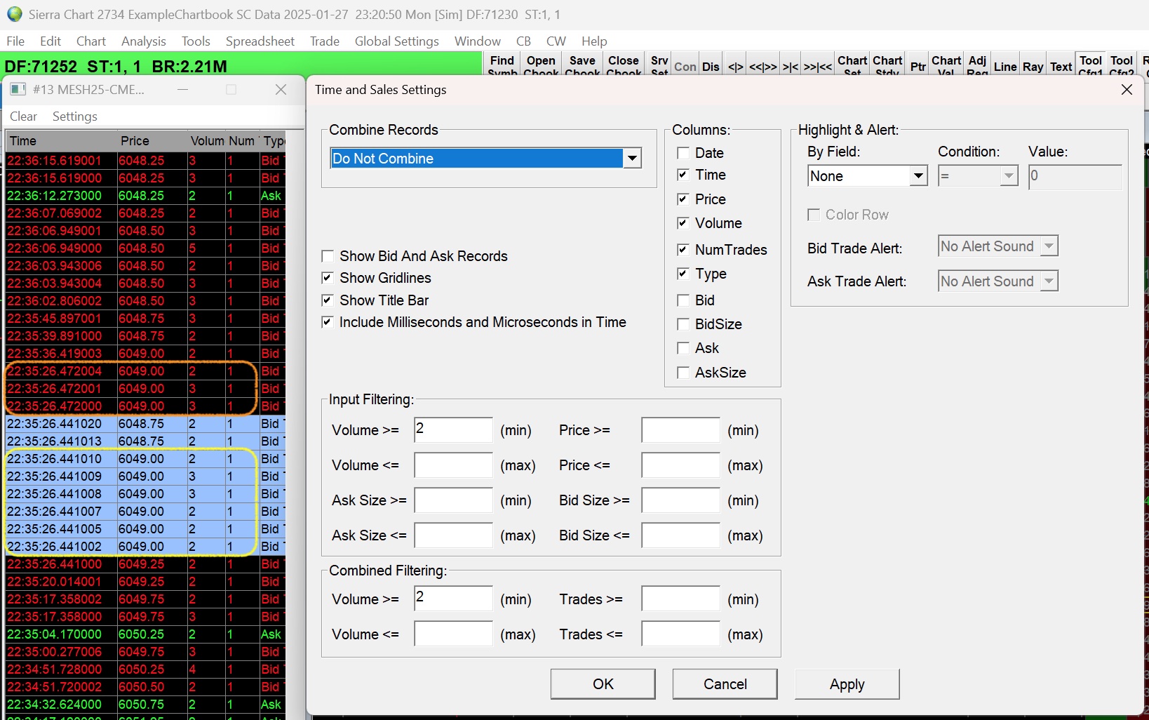 Hello, I am currently evaluating Sierra Chart, and I am noticing what appear to be data anomalies in the T&S data. I have marked up a screenshot of the T&S window along with the settings I am using. If you look at the entries marked by the yellow rectangle, you will notice they share the same millisecond and price values, but the microsecond values are non-sequential and do not start from 0. I am wondering if there are any missing data, e.g. 22:35:26.441000, -001, -003, -004, etc. The entries in the orange rectangle (and the entries in between the 2 rectangles for that matter) are also non-sequential. I have seen this on both Bid and Ask Type trades. From researching the documentation, I am aware that for Data Recording Suffixes: There is also a microsecond component to timestamps. The microsecond component is incremented by 1 anytime there a new record which has a duplicate timestamp as compared to the prior timestamp in the file. This microsecond component as described is also used even with the normal default recording mode for trades.