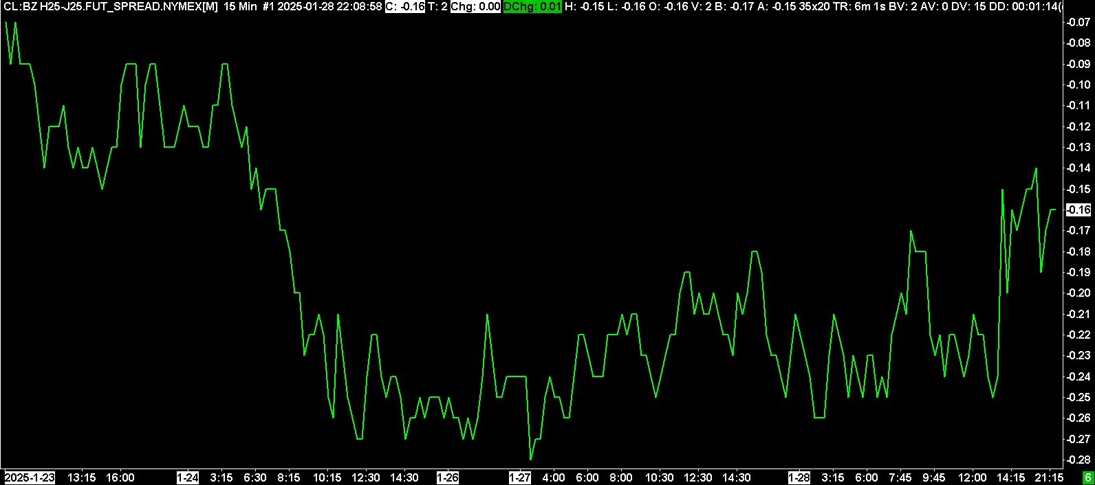 Historical chart of expired contract, CL:BZ Z24-F25.FUT_SPREAD.NYMEX: https://www.sierrachart.com/image.php?Image=1738121774511.png Intraday chart of currently traded contract, CL:BZ H25-J25.FUT_SPREAD.NYMEX: https://www.sierrachart.com/image.php?Image=173812201236.png Date Time Of Last Edit: 2025-01-29 03:42:33