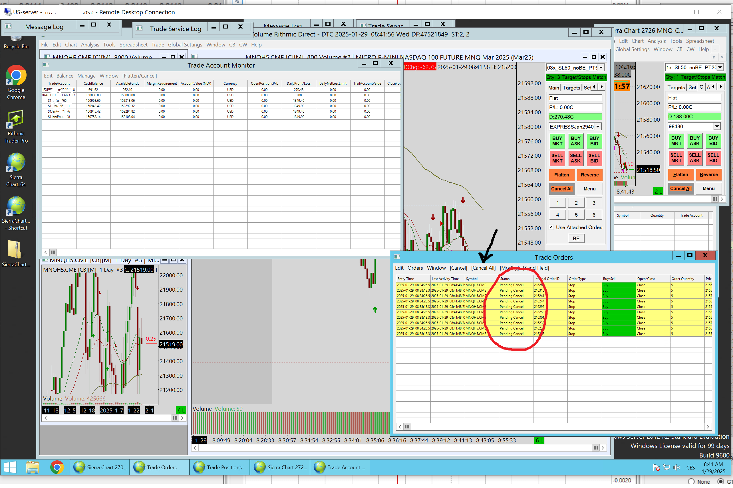 it almost seems like Rithmic does not return the order cancelled status OK properly once I become FLAT. I will try to compare with Rithmic Trader Pro next time when this happens to see whether all remaining orders were cancelled properly on their side Trade Servce log for accounts that needed cancel manually says it i guess 2025-01-29 08:41:30.195 | Order modification failed | Rithmic Direct - DTC (Order cancel/replace reject). Internal Order ID: 216301. Service Order ID: 267436389. Symbol: MNQH5.CME. Account: S1Jan69471576 * 2025-01-29 08:41:30.324 | Order modification failed | Rithmic Direct - DTC (Order cancel/replace reject). Info: order not present. Internal Order ID: 216289. Service Order ID: 267436387. Symbol: MNQH5.CME. Account: S1Jan69466591 * 2025-01-29 08:41:30.324 | Order modification failed | Rithmic Direct - DTC (Order cancel/replace reject). Info: order not present. Internal Order ID: 216307. Service Order ID: 267436379. Symbol: MNQH5.CME. Account: S1Jan29406581 * 2025-01-29 08:41:30.389 | Order modification failed | Rithmic Direct - DTC (Order cancel/replace reject). Internal Order ID: 216310. Service Order ID: 267436368. Symbol: MNQH5.CME. Account: S1Jan29406581 * 2025-01-29 08:41:30.389 | Order modification failed | Rithmic Direct - DTC (Order cancel/replace reject). Internal Order ID: 216283. Service Order ID: 267436395. Symbol: MNQH5.CME. Account: S1Jan69477808 * 2025-01-29 08:41:30.423 | Order modification failed | Rithmic Direct - DTC (Order cancel/replace reject). Info: order not present. Internal Order ID: 216280. Service Order ID: 267436393. Symbol: MNQH5.CME. Account: S1Jan69477808 * 2025-01-29 08:41:30.423 | Order modification failed | Rithmic Direct - DTC (Order cancel/replace reject). Internal Order ID: 216292. Service Order ID: 267436381. Symbol: MNQH5.CME. Account: S1Jan69466591 * Date Time Of Last Edit: 2025-01-29 17:41:11