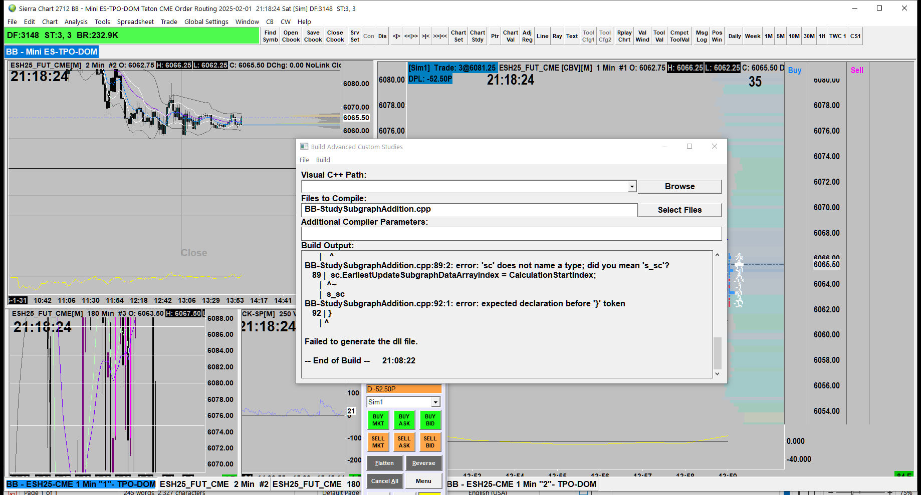 I sent the above post 2025-2-2 and have not heard back anything. Did I not post this correctly ? [2025-02-02 06:03:08] #3 [Go To First Post] User771976 - Posts: 15 (Public) 0utlier (Not publicly displayed) | Usage Ending Date: 2025-02-11 | Denali Exchange Data Feed Included with Package Have been working on this for a bit and keep running into dead ends. Please see the attached build error messages. I also included a PDF of the Notepad file. Edit | Hide | Delete imageSierra_Chart_MainWindow_2025-02-01 21_38_23.779.png / V - Attached On 2025-02-02 06:01:11 UTC - Size: 134.96 KB - 8 views imageSierra_Chart_MainWindow_2025-02-01 21_18_22.889.png / V - Attached On 2025-02-02 06:01:18 UTC - Size: 134.64 KB - 6 views attachmentBB-StudySubgraphAddition.pdf - Attached On 2025-02-02 06:01:49 UTC - Size: 67.45 KB - 6 views |