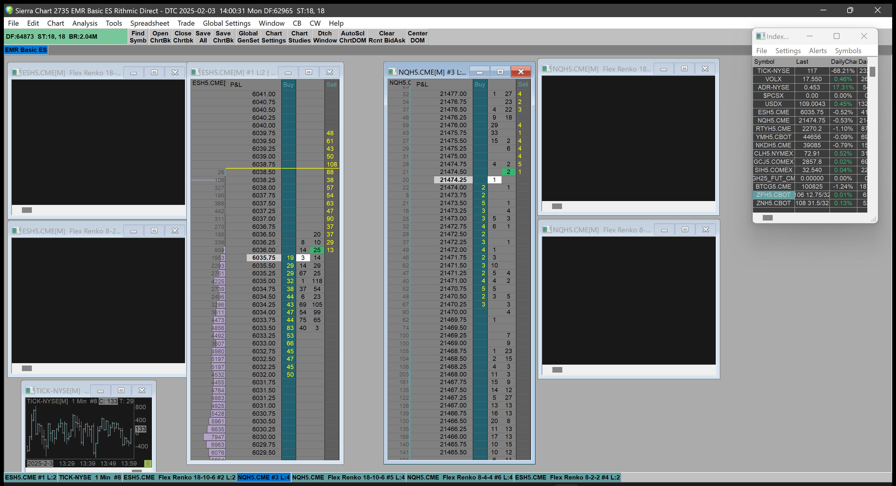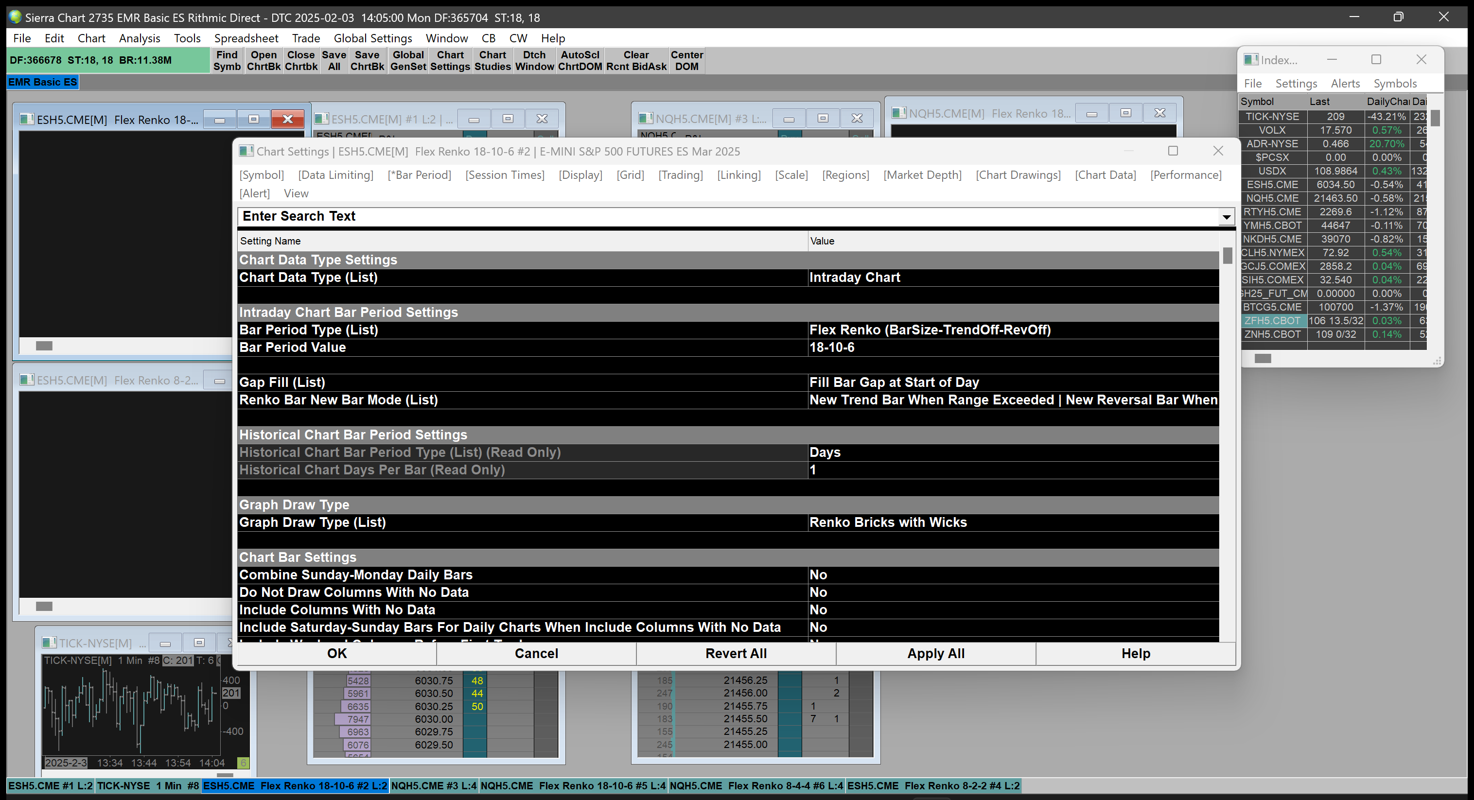 Thank you for the follow-up. I forgot to mention in my original post that the Renko charts returned to normal functioning when I reverted my Sierra Charts back to the previous version. Additionally, it is not only the Flex Renko that isn't working on the current version. It is all Renko bar period options. Attached is a screenshot with the market open using the current version. https://www.sierrachart.com/image.php?Image=1738609231449.png This is a screenshot of my current chart setup https://www.sierrachart.com/image.php?Image=1738609502895.png |