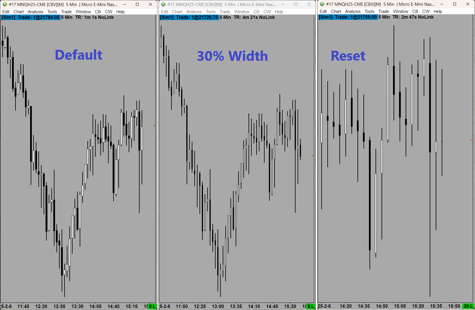 Thank you John, I can not Increase space between the Bars. Only Decrease width wider bar. NinjaTrader looks better with larger space I do not know how can I solve it at SierraChart. Date Time Of Last Edit: 2025-02-04 22:15:33
