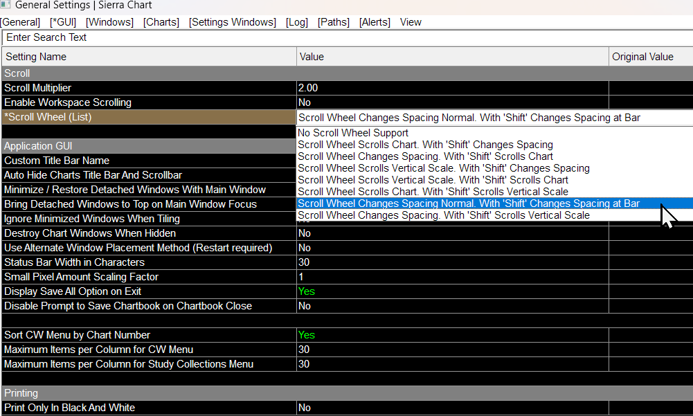 Dear Sawtooth, Thank you for your help. Not possible to increase the space between the CandleStick Bars, just decrease bar Width. That is the problem. If it is possible please forward my request to SC developers. Maybe they can fix it in the next update. I thought in the Scroll Wheel menu was the solution, but unfortunately it isn't either. Date Time Of Last Edit: 2025-02-06 15:08:31