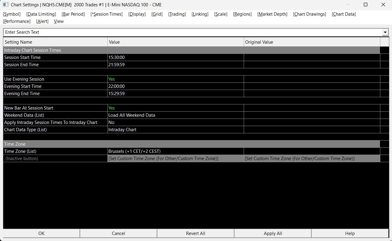 The option for "New Bar At Session Start" applies to both RTH and ETH. So if you only want it to occur at one of the times, you would need to change your Session Times such that the Start Time and End Time cover the full trading hours you want in the chart and not use the Evening Session. Also be aware of the following setting: Chart Settings: Split Data Records (applies to Number of Trades, Volume and Range charts) (Chart >> Chart Settings >> Chart Data >> Chart Data menu) For the most reliable, advanced, and zero cost futures order routing, use the Teton service: Sierra Chart Teton Futures Order Routing |