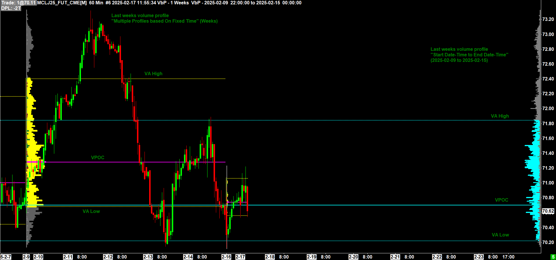 Hi, I'll try to be as concise as possible but please bare with me. I have a VBP study set up as "From start date-time to End date-time" to cover the previous week (2025-02-09 to 2025-02-15) Mon-Sat, aligned to the right. On the same same chart I also have another VBP study set up as "Multiple Profiles Based On Fixed Time" as "Weeks", so this gives me all previous weeks volume profiles, aligned to the left. So in theory, the "start date-time to end date-time" profile on the right should be identical to the most recent "multiple profiles based on fixed time" profile on the left, however, the VA levels and the VPOC levels are wildly different, in the range of 50-60 tics different (MCL symbol). I've been careful to account for global market open and close times. I've always noticed slight differences but they've been negligible (a few tics, maybe 5 at the most), but not how I'm seeing it now. Can you shed any light on this for me please? One thing that has changed is that I had to roll-over the symbol this morning, so I'm assuming this has something to do with it? I have posted a screenshot below. Many thanks. https://www.sierrachart.com/image.php?Image=1739793345544.png |