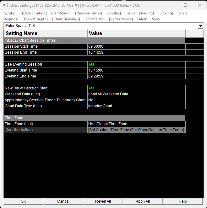 Hello, I am guessing that I am missing something trivial, but I have been searching and reviewing the documentation/support board for help to resolve this and cannot figure out what I am doing wrong. I have added "Cumulative Delta Bars - Volume" and "Numbers Bars Calculated Values" studies to my chart and expect the cumulative delta value to reset at the start of my session time (09:30:00, see Chart Settings image), but instead it only resets at the start of the EVENING session (16:15:00; see graph regions 4 & 5, where values continue accumulating at 09:30 but reset at 16:15). The only way I can get values to reset at the start of the regular session is to set the "Reset at Both Session Start Times" study input to Yes, which I did on the duplicated studies in graph regions 2 & 3. Data Configuration is set to Tick by Tick. How do I get it to only reset at 09:30:00 and not 16:15:00? (exchanging my regular and evening session times is not an option, as I have other studies dependent on the session times) Chart Image: https://www.sierrachart.com/image.php?Image=1740089215167.png Thanks, as always! p.s. the reference page for Cumulative Delta Bars - Volume (Cumulative Delta Bars - Volume) does not include descriptions of the first two inputs, "Perform Rolling Calculation" and "Rolling Calculation Length". The same is true for the other two Cumulative Delta Bar study variants. |
