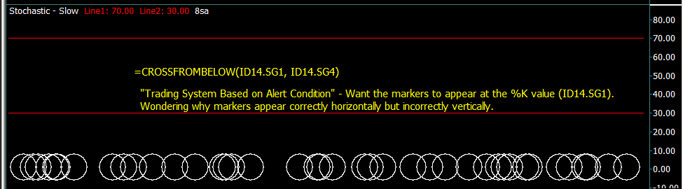Wanting markers to appear at the %K value (ID14.SG1) using a "Trading System Based on Alert Condition". =CROSSFROMBELOW(ID14.SG1, ID14.SG4) Wondering why markers appear correctly horizontally but incorrectly vertically. |