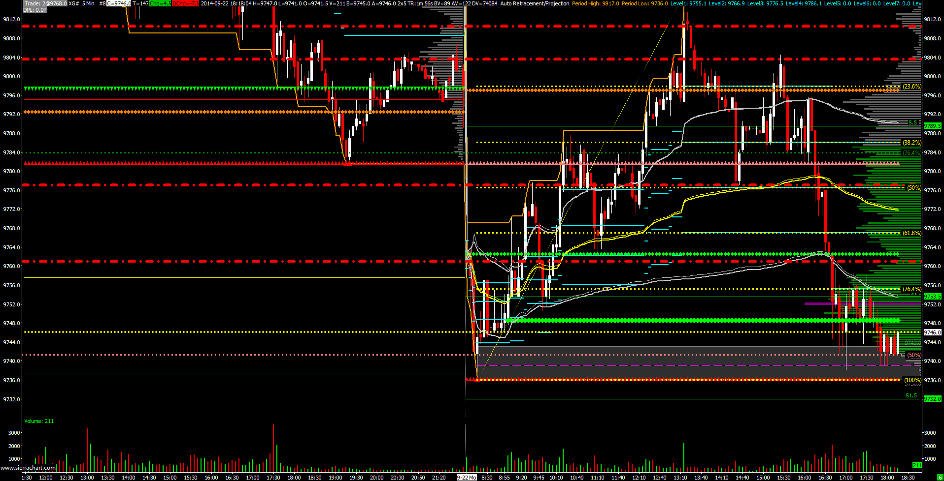 How can I automatically display intraday fibonacci retracement using a study (I mean not manually using the price retracement tool), that show the fibo levels like 38,2 or 61,8 with respect to the current intrady's high and low? I already tried the study Auto Retracement/Projection with the settings Time period Unit = "days" Time period Unit Lenght = "1" Calulation method = "Retracement" .... ...unchanged .... New Period At Day Session Start... Evening session = "no" Caluclation Reference Valus = "Automatic" The result is a mess of many interupted blue lines, but no clear intrady fibo levels at e.g. 61,8% or 38,2% are displayed. Who can help please? |