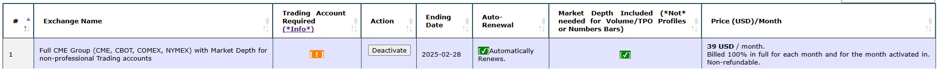 The exchanges renew on a calendar month basis. Therefore, if you were going to continue with the "Full CME Group (CME, CBOT, COMEX, NYMEX) with Market Depth for Non-Professional Trading Accounts", then you would need to have at least $39.00 in your account prior to March 1, 2025, in order for the exchange to automatically renew. The remainder of the $85.00 that is referenced ($46.00) is needed in your account prior to March 9, 2025, in order to renew your Service Package on that date. Keep in mind the Service Packages renew on a rolling 31 day cycle. I do not want to keep this subscription after February 28, as I plan to switch to "CME with Market Depth for non-professional Trading accounts" on March 1, which costs 13 USD since I only trade ES and NQ.