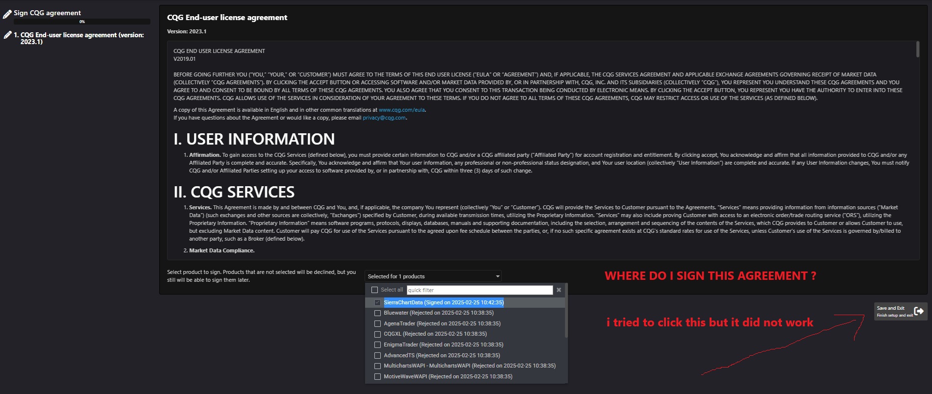 I need help activating the Denali Data Feed. I am currently using a Topstep account in a trading combine. My plan is to use Sierra Chart’s Denali Data Feed for market data, but for order routing, I need to use Rithmic. I also want to subscribe to live CME data at a lower cost, and for that, I need a live funded futures account, which I now have with AMP Futures. I have received a username and login credentials from CQG and have logged in with them (as I understand it, I need to log in at least once a month for at least 10 seconds). I have also signed the agreement to obtain non-professional status so that I can get CME live data at a lower cost. However, when I try to activate the services, it still says "Trading account required" with an orange marker. I don’t know what I am doing wrong. Can you please help? Additionally, I would like clarification on what "Data/Trade Services" means. Does "Data" simply refer to market data, such as live CME data, and "Trading Service" refer to order routing, meaning the system that sends orders to CME? Lastly, when I log into CQG, I am required to sign an agreement. I can find and read the agreement, but I cannot find a button or option to actually sign it. I have tried clicking the "Save and Exit" button at the bottom right, but it doesn’t seem to help. How do I properly sign the agreement? |