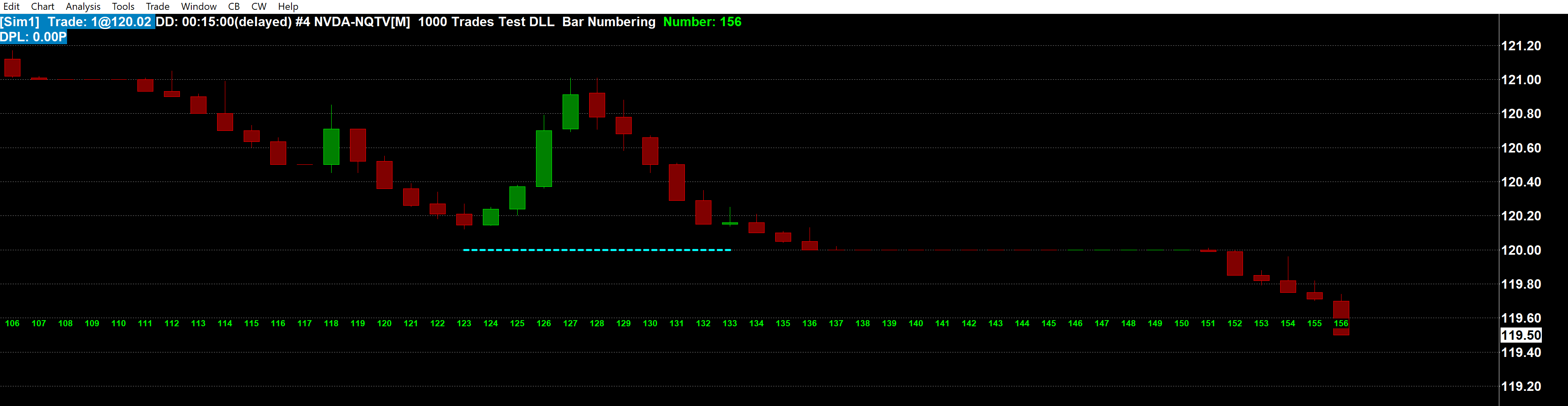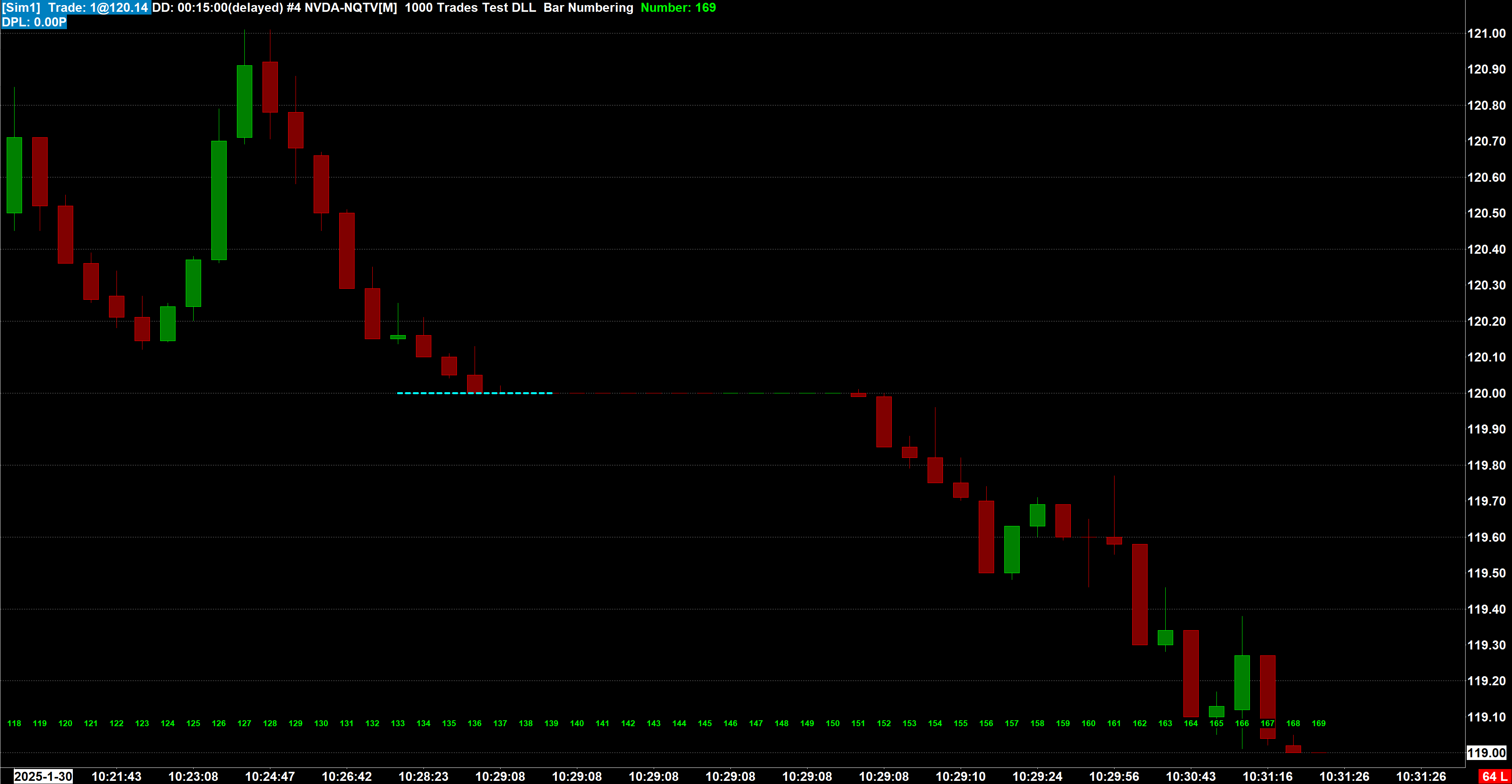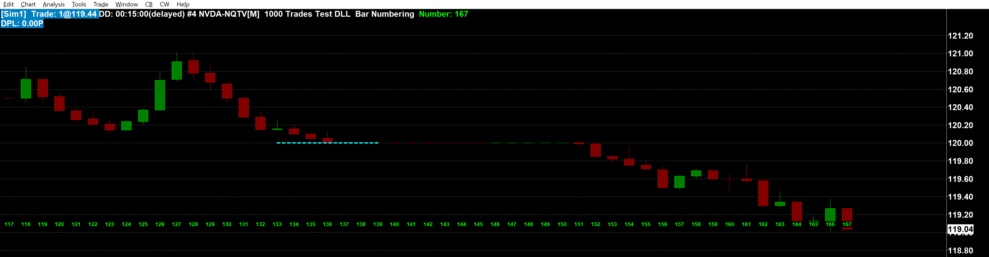 Problem Description: When I use the s_UseTool drawing tool to draw a line on the chart, it only displays partially. I observed that this issue occurs when the drawing line starts/ends with 3 or more dashed bars (High = Low bars). I am using a manual loop. Why I Don't Think It's an Issue with My Code: After simply changing the index, the drawing displays correctly. This can be observed in the attached screenshots: good.png (index = 133) and bad.png (index = 143). Chart: NVDA_NQTV 1000 Tick Bar Version: 2741 Date: 2025-01-30 to 2025-01-30 core code: if (index == 133) { s_UseTool Box; Box.Clear(); Box.ChartNumber = sc.ChartNumber; Box.DrawingType = DRAWING_LINE; Box.AddMethod = UTAM_ADD_OR_ADJUST; Box.BeginValue = 120.00f; Box.EndValue = 120.00f; Box.Color = RGB(0, 255, 255); Box.BeginIndex = index; Box.EndIndex = index-10; Box.LineWidth = 5; Box.LineStyle = LINESTYLE_DASH; Box.TransparencyLevel = 50; Box.AddAsUserDrawnDrawing = 1; LineNumberCounter++; Box.LineNumber = LineNumberCounter; sc.UseTool(Box); } |