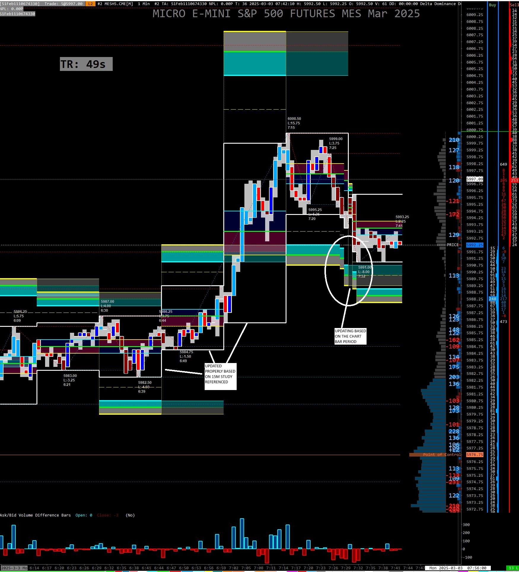 I have a study that I have setup that has the auto retracement that references another study (period ohlc) that is setup for 15m prior candle. If I refresh the study it looks nice and clean and references the 15m prior as indicated. However, as it is developing it looks choppy and goes off of whatever current candle period I am using. Is there a way to have this study update quicker and without me having to hit my hotkeys every time?