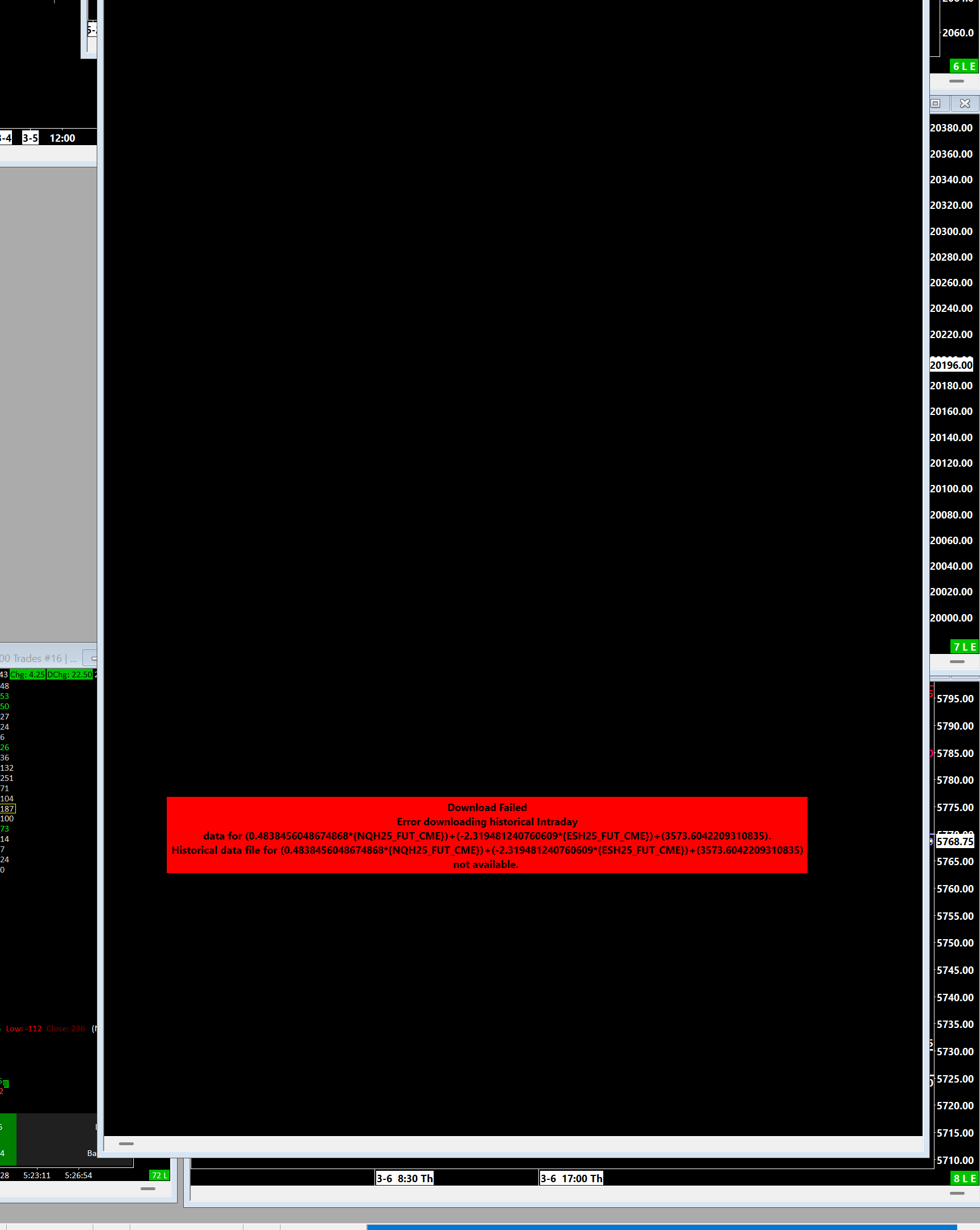 Hi John, A client and I are stumped. He has SC obvs and he sent me a formula for an NQ - ES spread he trades so that I can have a chart on my pc. Unlike me, he codes, programs and is everything I am not. He Team-viewed into my PC to check everything was exactly as he had, and we still cannot get the chart to generate. We have used both NQH25-CME, and NQH25_FUT_CME in the formula. The former works perfectly on his PC. When we go to generate the chart, trying both formulas, we get the red error message as seen in attachment. We tried the 'translate to current symbol', and that too generates the same red error message. Mike, again, has jumped on my PC to confirm there wasn't an error on my part. Please can you help us to solve this issue? I appreciate your time looking at this, and hope you can give us a fix. thank you so much, John, for your time. Karen ps there wasn't room for symbol sett 2, but it's just showing the same thing as symbol set 1, but with the different symbol. |