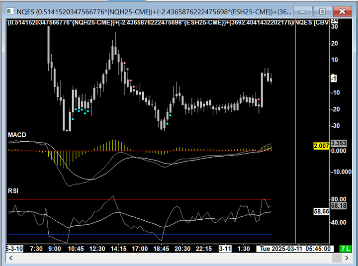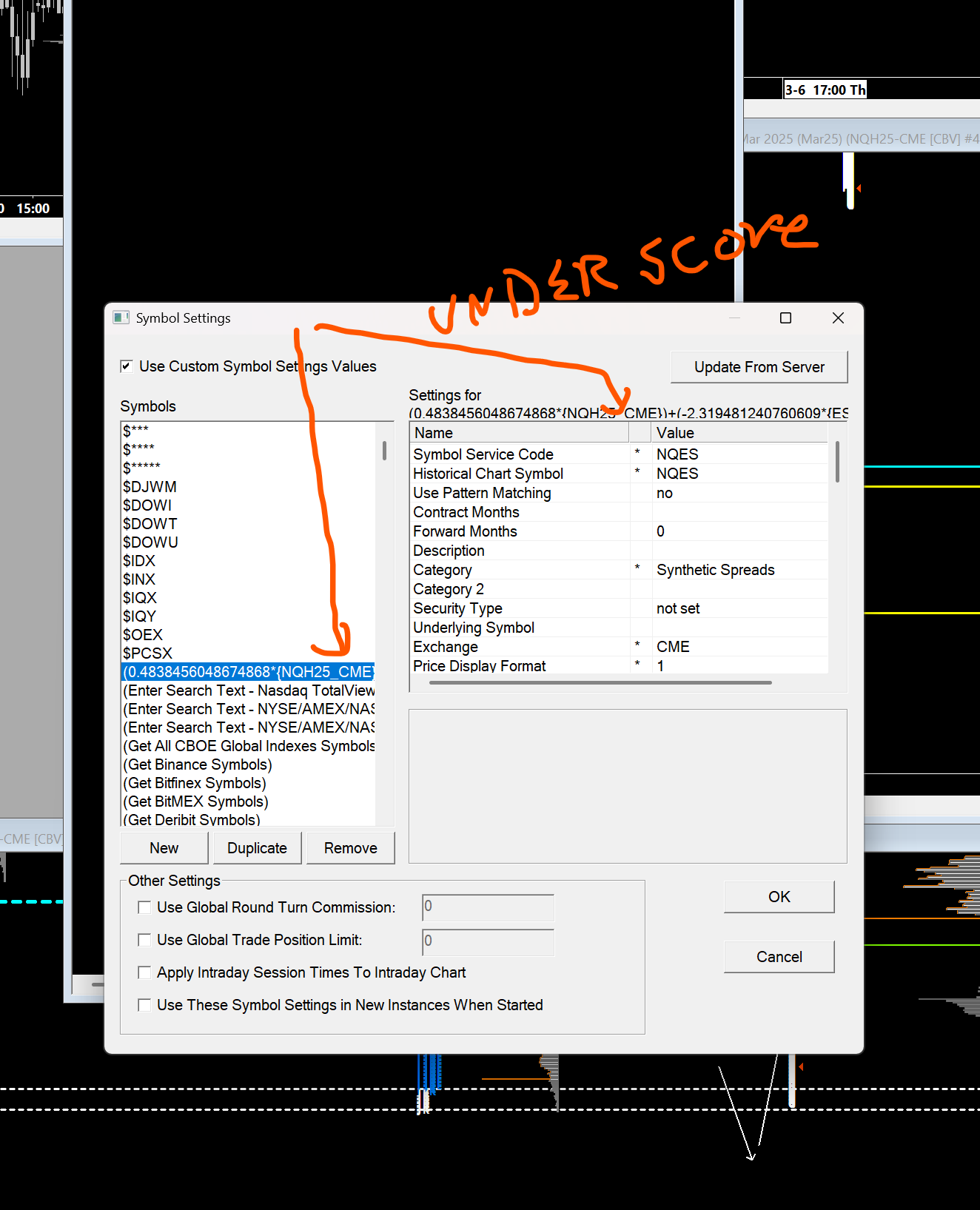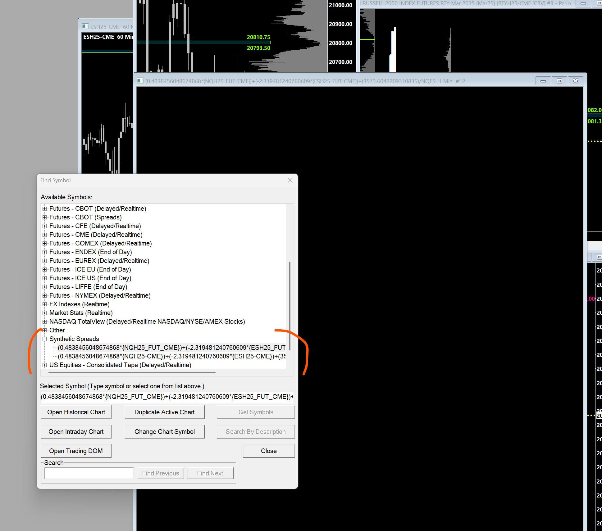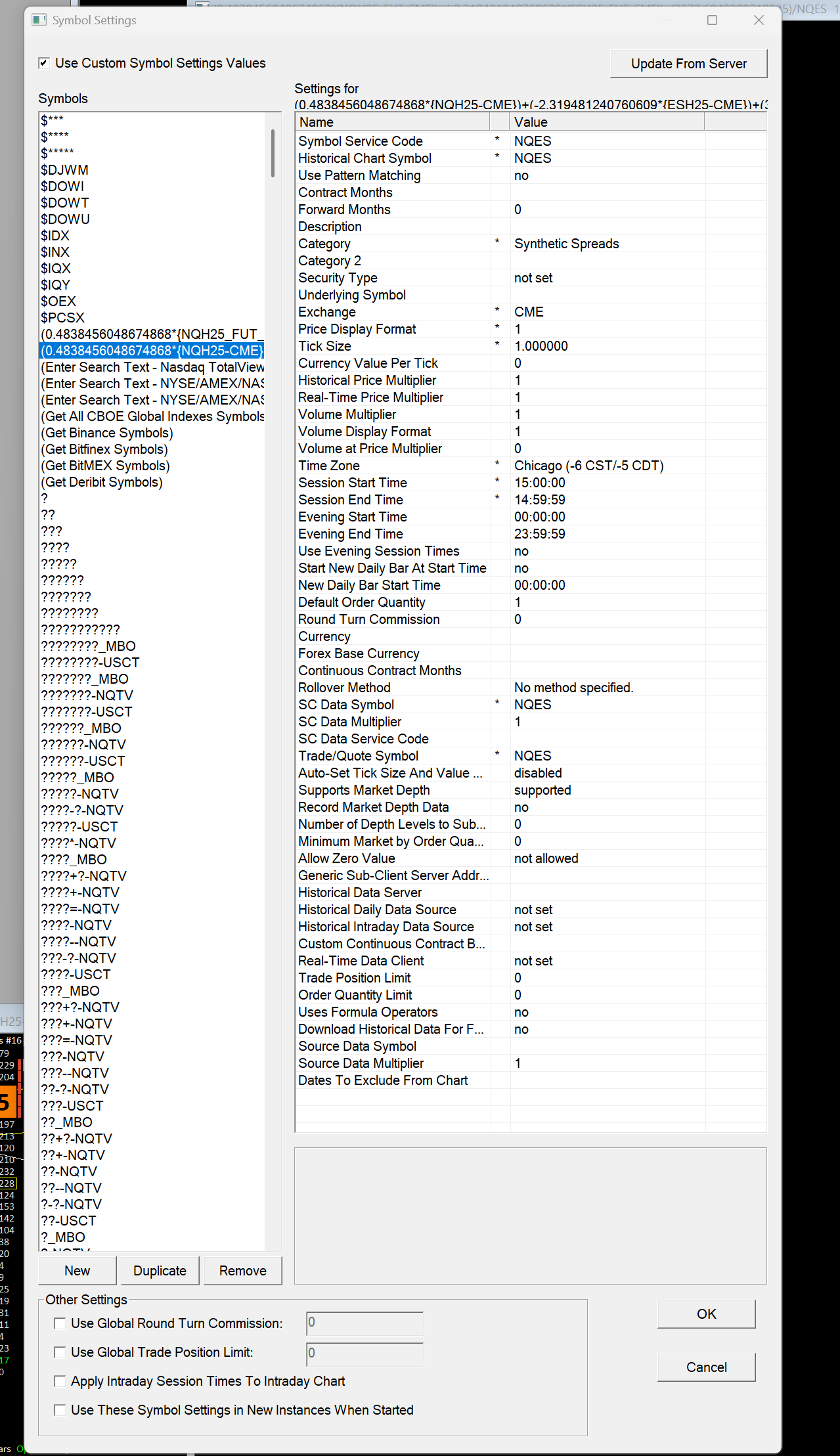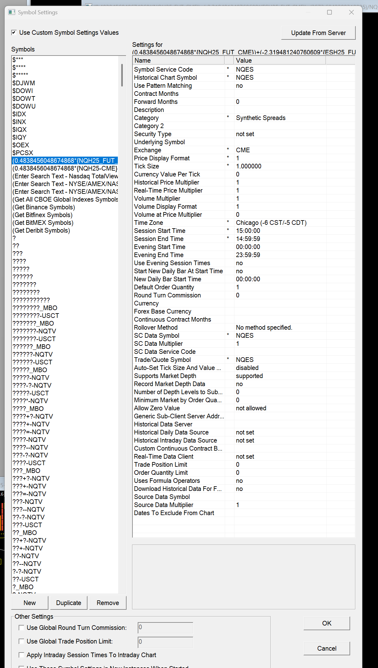 Sorry - it would be a hyphen, so it would be "NQH25-CME". The other thing is to ensure you have everything setup properly for that symbol. Follow the instructions at the following link: Custom Calculated Symbols: Instructions If the above does not solve, it then start with a simpler formula, avoid the very long decimal numbers and see if it works. If so, then expand the formula out further. If it does not work with a simpler formula, then most likely it is related to the setup we referenced above. For the most reliable, advanced, and zero cost futures order routing, use the Teton service: Sierra Chart Teton Futures Order Routing |