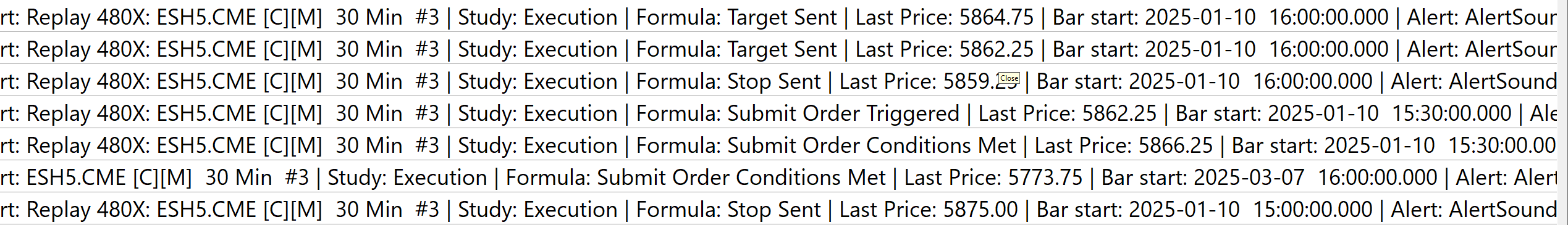 Thanks. You helped identify an error. So this normalization is specifically for the ES contract. Logic was to divide the Open PnL by the contract value (eg. ES is $50 per point) to get the value per point which would still be in dollar terms and then divide that by the tick size to get the amount of ticks moved. For example, if Open PnL in ES is $500 we would divide this by $50 to get 10 points. We could then divide this 10pts by 0.25 (i.e. ES tick value) to get 40 ticks The error is that this computation doesn't generalize. It only assumes that we are trading one lots. The correction is to: $500 (open pnl) / $50 (point value)= 10 (number of points) 10 (number of points)/ X (the number of lots traded)= Y (points per lot) Y (points per lot) / 0.25 (tick value) = number of ticks for given lot size. I will implement this fix and retest, but checking the logs, the system was trying to generate the orders. (see attached) |