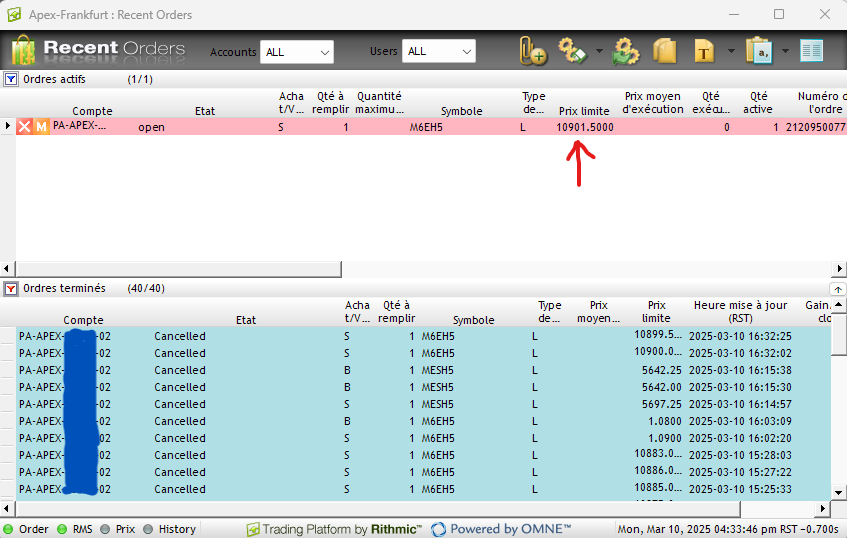 Hello, I recently wanted to try my setup on EuroFX (6E or M6E). I normally trade ES and everything is fine on this side. But the problem I have is when I try to put a sell limit order, for example at 1.09015 it actually put my limit at 10901.50 so it multiply it by a factor of 10000 (I can see my order on Rtraderpro). And I cannot take buy limit orders because it think the price is at 10000 so it automatically fill me market when I try. I tested on Ninjatrader and everything work fine so I don't think it's my data feed, and I also tried the method of "updating my symbol setting from server" and applying the "Global symbol settings" in "chart setting" but it change nothing. I noticed that when I change the "Real time price multiplier" my order change so I don't know if it's related or not. I put a screen shot of the price on Sierra chart the price on RtraderPro and my symbol settings. Thanks in advance for the help. |