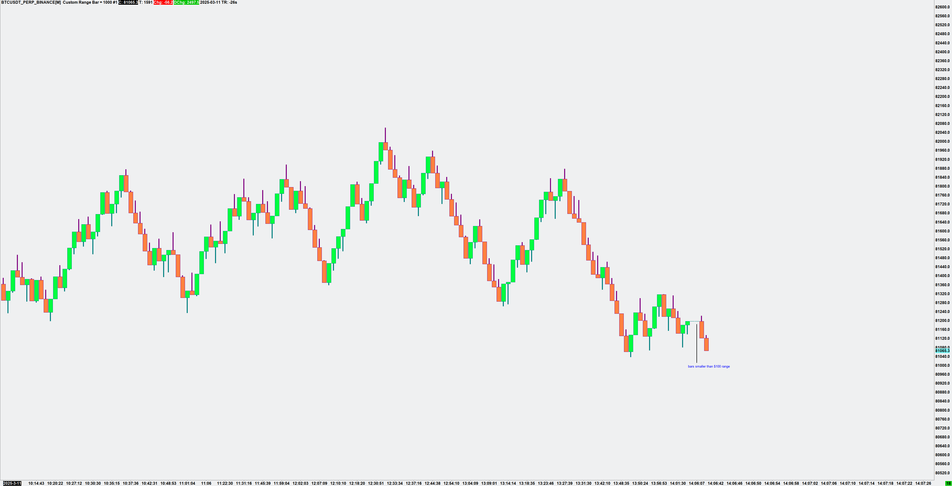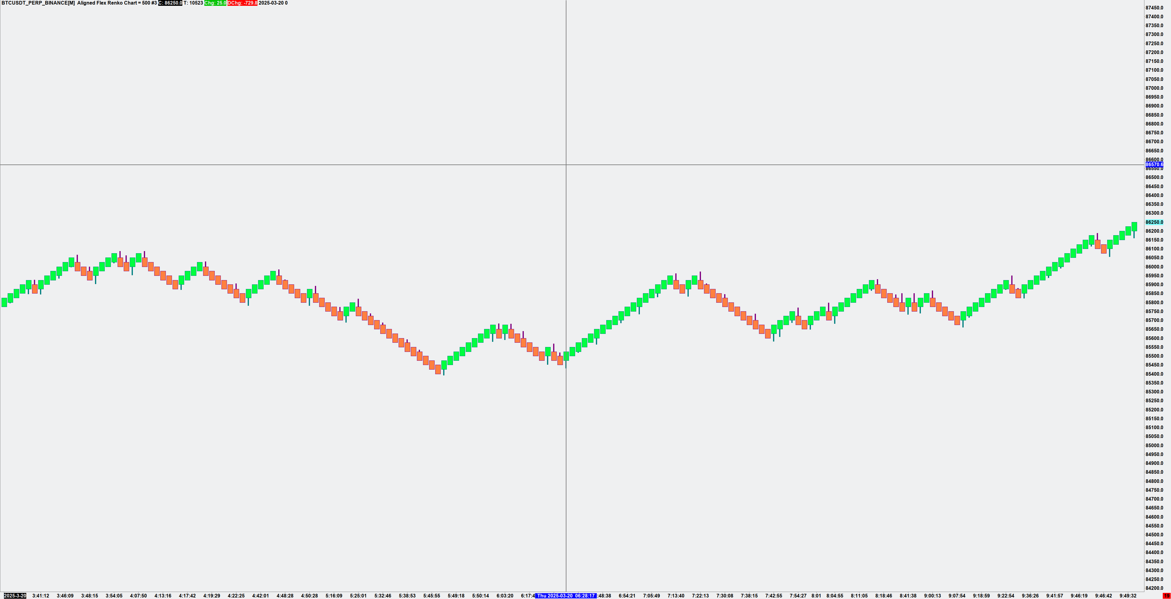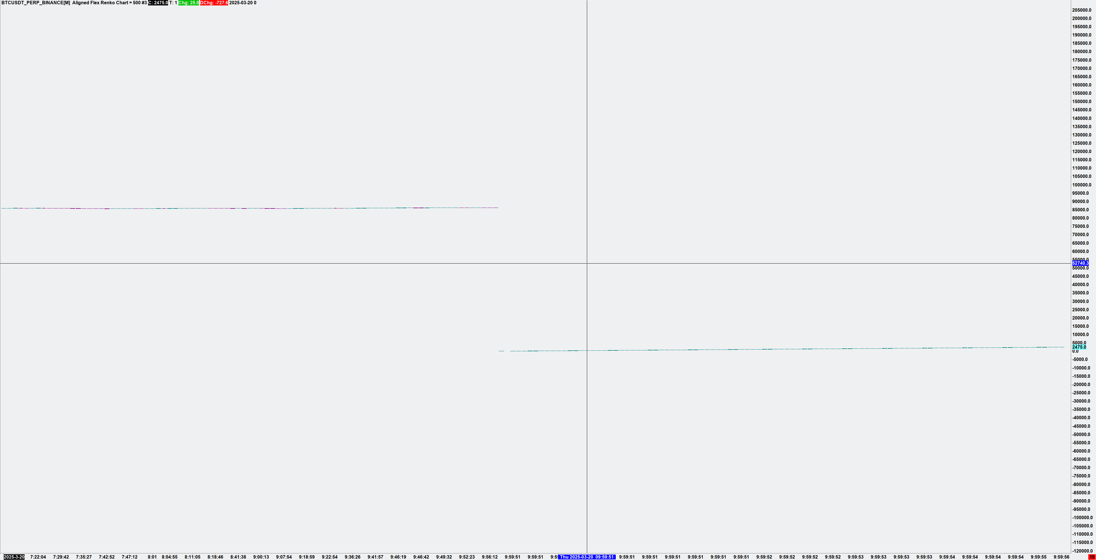 Thank you! In the meantime I manage to make an aligned flex renko chart based on 1s data: https://www.sierrachart.com/image.php?Image=1742461969909.png However, the most recent bars look squeezed like this: https://www.sierrachart.com/image.php?Image=1742462003713.png Is this something related to the problem above or it's something else? Thanks! LATER EDIT: I tend to believe that the squeezed bars are actually many incomplete bars like these: https://www.sierrachart.com/image.php?Image=1742567925853.png So it looks like it's the original problem. Date Time Of Last Edit: 2025-03-21 14:40:53