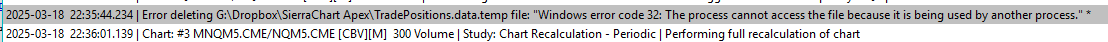 I have found the error message that causes the box to be unchecked. It is not something on my side. It happens when the attached error message appears in the message log. 2025-03-18 22:35:44.234 | Error deleting G:\Dropbox\SierraChart Apex\TradePositions.data.temp file: "Windows error code 32: The process cannot access the file because it is being used by another process." * |