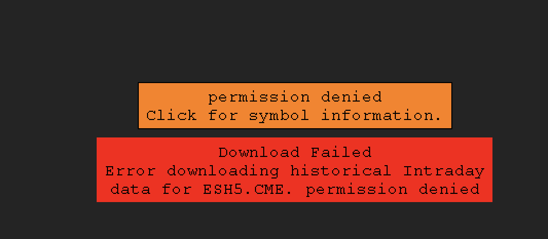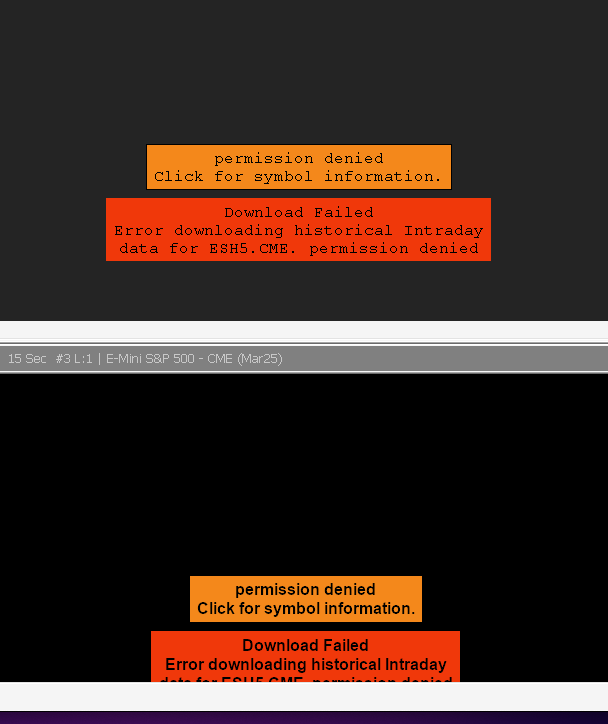 You are still getting a "Permission Denied" error. All the information we have for that error is in the documentation here: Rithmic Trading Platform Service: Permission Denied Resolution Procedure We are just as frustrated with this error as you are. The error comes from Rithmic, and they own the interface between themselves and Sierra Chart. Yet they have yet to deal with this in several years that it has been occurring. There is nothing we can do about this - if there was, we would have resolved it. The only other option you have is to not use the data from Rithmic and to use the data from our Denali Exchange Data Feed. This way you would not need to enter the Username/Password for the data fields for Rithmic on the Data/Trade Service Settings window. This also means that you would have to have a live, funded futures trading account in order to get the data at the non-professional rates. Refer to the following: Denali Exchange Data Feed: Understanding and Accessing Data From the CME, CBOT, NYMEX, COMEX Exchanges If you do decide to go this route, you would follow the instructions at the following link: Denali Exchange Data Feed: *Setup Instructions: CME/CBOT/NYMEX/COMEX Exchanges* For the most reliable, advanced, and zero cost futures order routing, use the Teton service: Sierra Chart Teton Futures Order Routing Date Time Of Last Edit: 2025-03-14 19:41:29