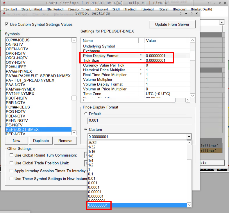 Dear Support, Could you please add the ability to use smaller increments/settings for Price Display Format and Tick Size in the Symbol settings? Currently, the lowest available option allows selecting up to 8 decimal places, but certain products (especially crypto) trade in even smaller increments (e.g., 9, 10, or 11, etc decimals). I’m attaching a screenshot as an example—this is a crypto symbol from the BitMEX datafeed, which trades in 9-decimal increments, but the system currently only allows setting it to 8 decimals. Would it be possible to extend this setting to accommodate these smaller increments? Thanks in advance for your help! |