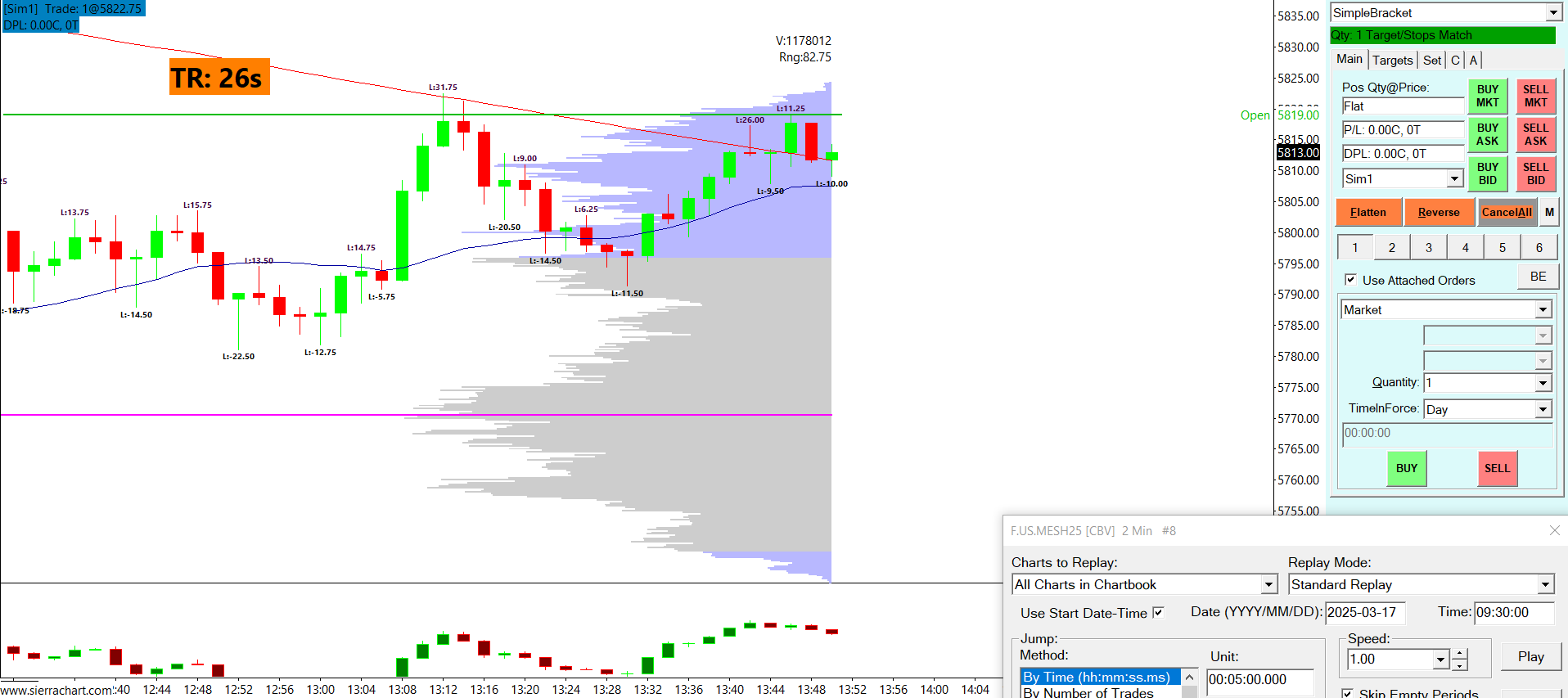 We are not understanding the issue based on the image you provided. The image shows that you are starting the Replay on March 17, 2025 at 09:30. You should have this data loaded in the chart. But, in general, you need to have the data loaded in the chart for which you want to replay. So if you want to start a replay on March 4, 2025, then the charts need to have the data loaded back to that time to begin with. The replay only replays the data that is in the chart. For the most reliable, advanced, and zero cost futures order routing, use the Teton service: Sierra Chart Teton Futures Order Routing |
