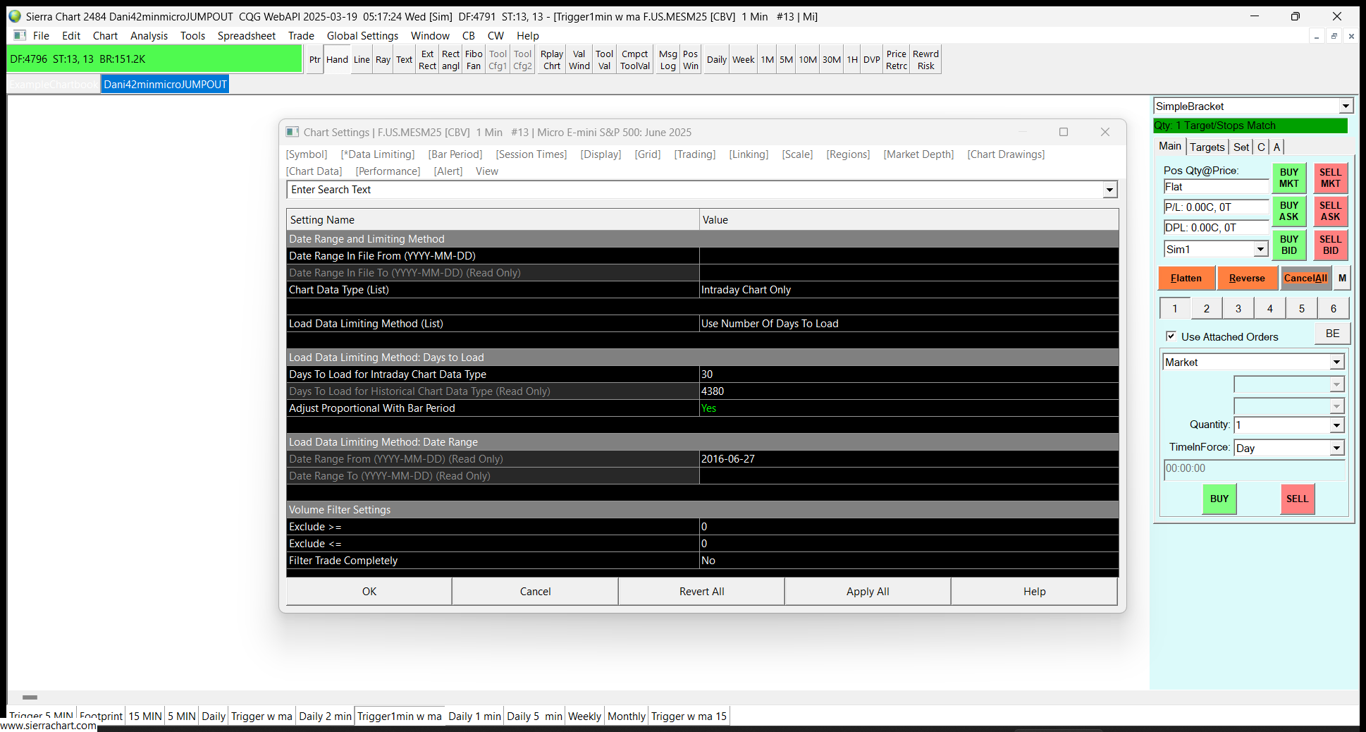 What is "Chart >> Chart Settings >> Data Limiting >> Load Data Limiting Method" set to? If it is set to "Use Date Range", then what are the following two items on that tab in the section for "Load Data Limiting Method: Date Range" set to: - Date Range From: - Date Range To: For the most reliable, advanced, and zero cost futures order routing, use the Teton service: Sierra Chart Teton Futures Order Routing |