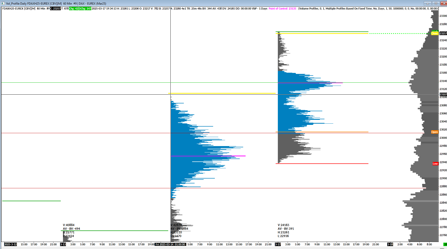 Dear Team, just noted that using dax future on eurex, e.g. FDAXH25-Eurex, the platform shows different closing levels. Here attached the screenshots with some examples from March 14th 2025: 1) On the "historical" chart, the daily candle closes a 22948. 2) On the "Volume profile" chart, it shows 23110 using the study "Daily OHCL"... (yellow line on the chart). 3) On the "1 minute candle" chart, it shows 22090 as eod closing candle. I am quite new in Sierra and I would really appreciate if you could explain me the "differences", meaning what the platform provides in this case and how to consider them / or any advise for set up in this case. The session time of the graphs is set from 1:00:00 to 00.59:59. Thanks a lot. Kind regards, Luigi |