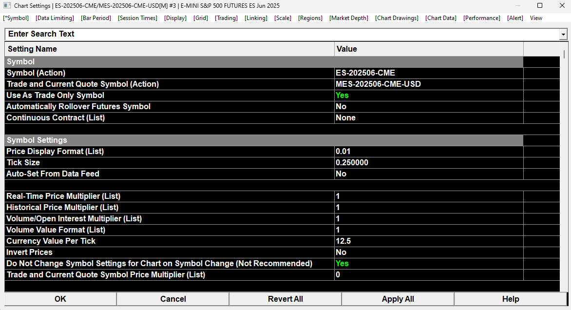 We are not quite understanding the setup. In general, you will see the orders and positions on charts that have the same symbol either as the Main Symbol or as the "Trade and Current Quote Symbol". So if you are trading the MES, then the MES needs to be either the "Symbol" or the "Trade and Current Quote Symbol" for a chart. If this is not working for you, then start by referring to the following: Chart Trading and the Chart DOM: Viewing Orders and Trade Position on the Chart / Trade DOM For the most reliable, advanced, and zero cost futures order routing, use the Teton service: Sierra Chart Teton Futures Order Routing |